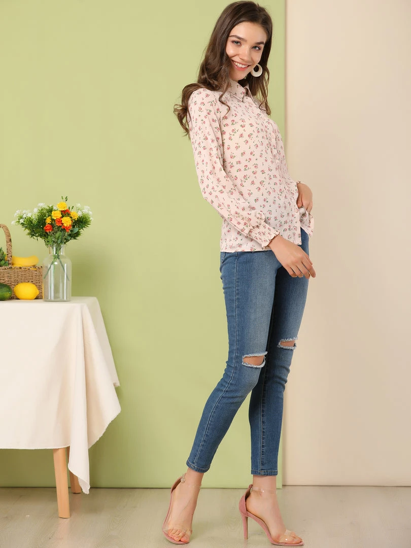 Allegra K Women’s Long Sleeve Point Collar Top Blouse Floral Button Down Shirt