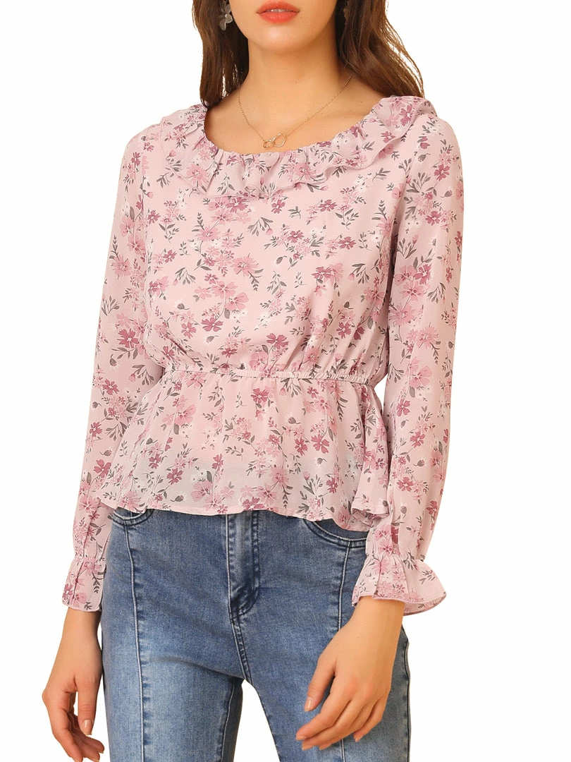 Allegra K Women’s Long Sleeve Ruffle Floral Peplum Top Chiffon Blouse