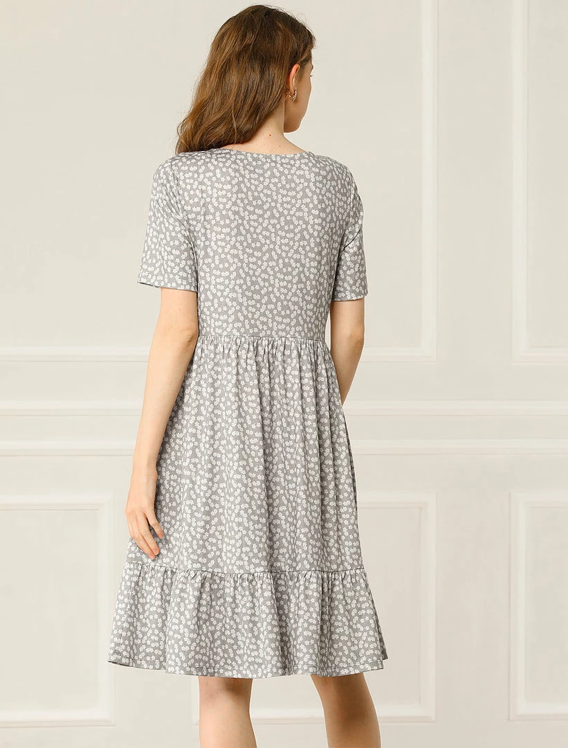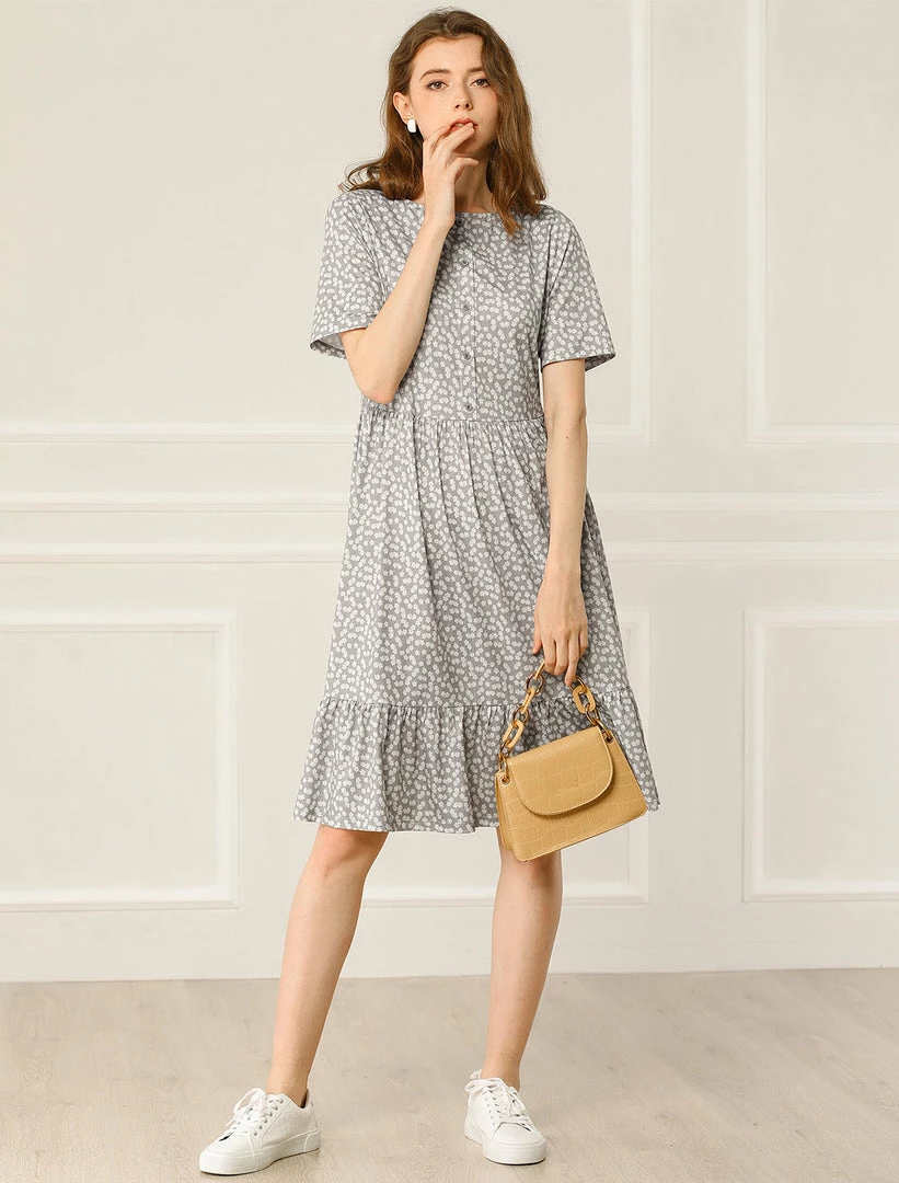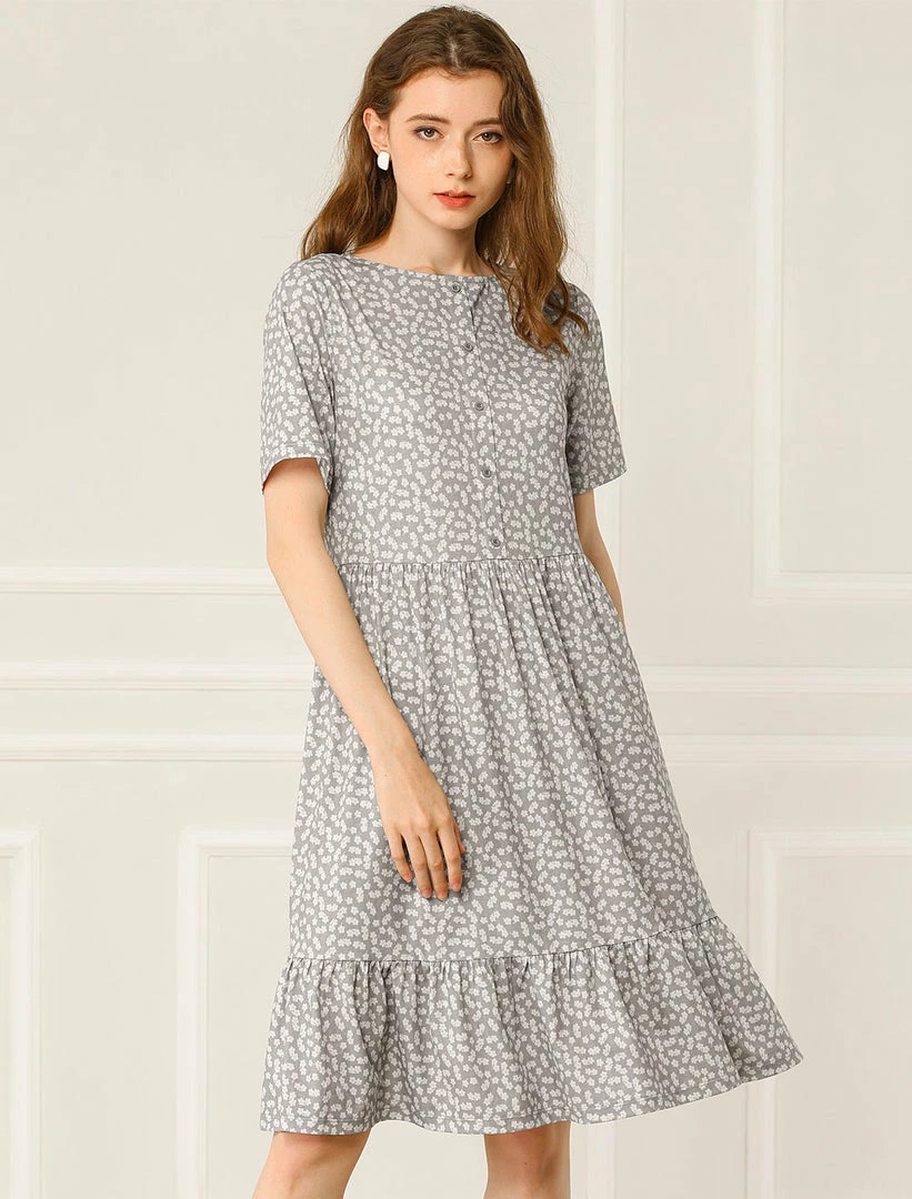 Allegra K Women’s Loose Floral Print Short Sleeve Button Decor Ruffle Hem A-Line Dress