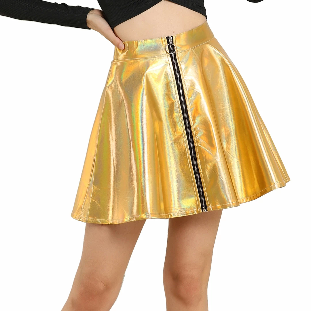• High-waisted holographic mini skirt fashioned with attractive colors.