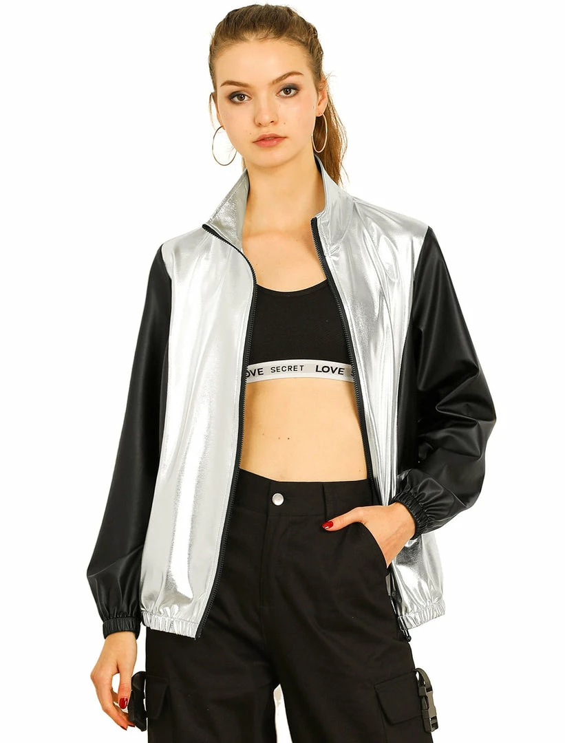 Allegra K Women’s Metallic Shiny Long Sleeves Zipper Contrast Holographic Jacket