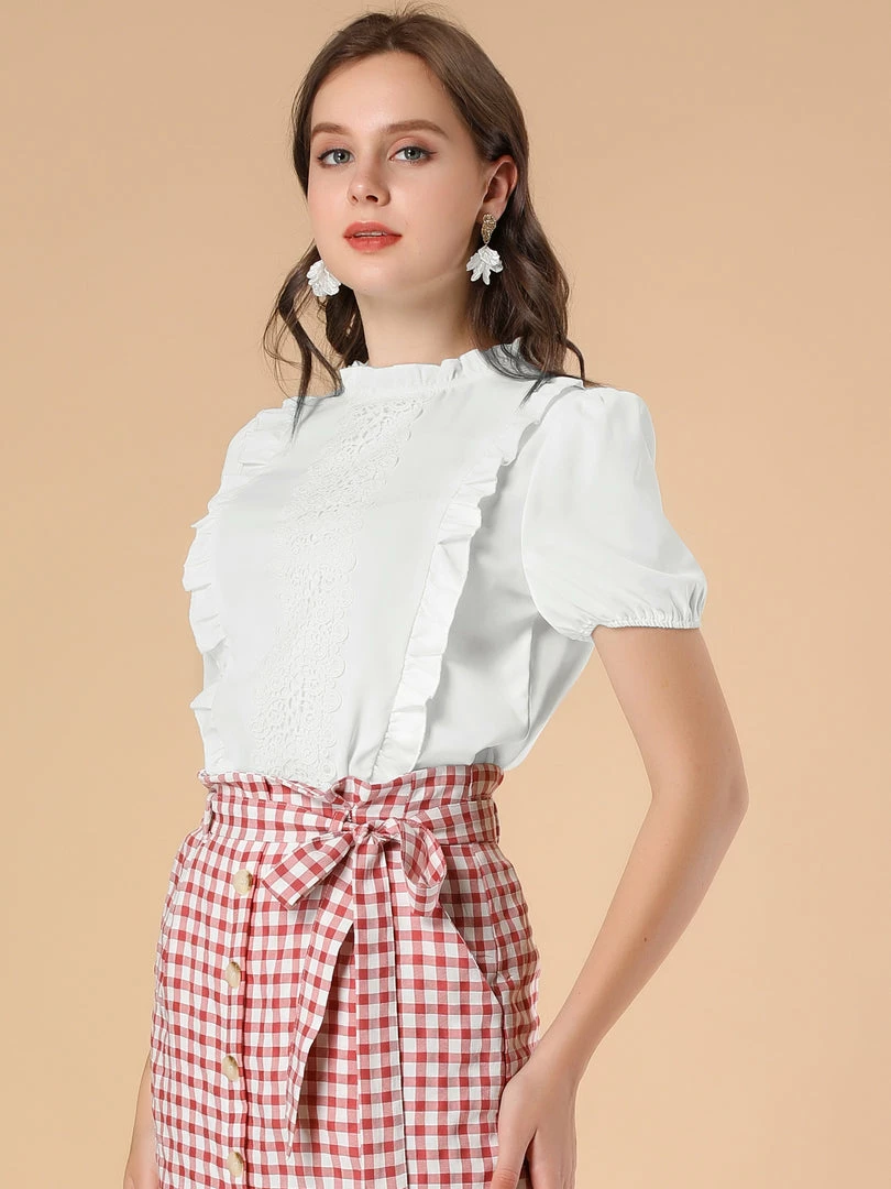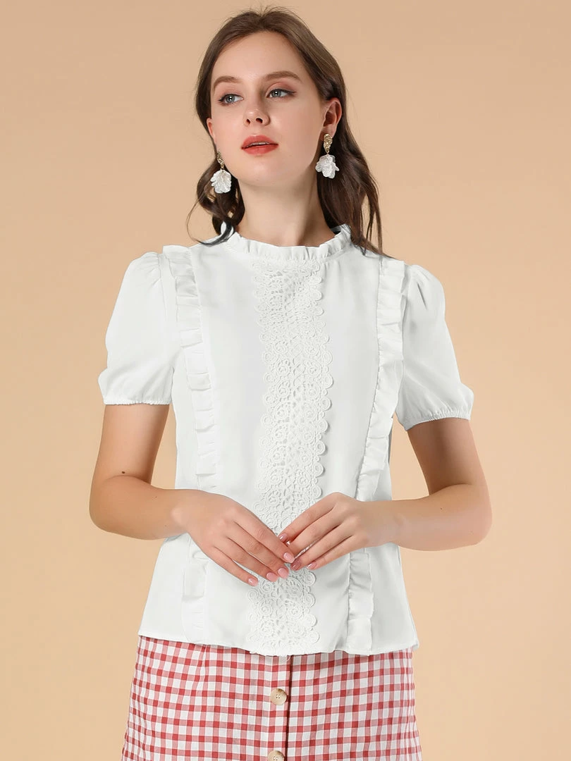 Allegra K Women’s Mock Neck Ruffle Short Sleeve Crochet Lace Work Office Blouse