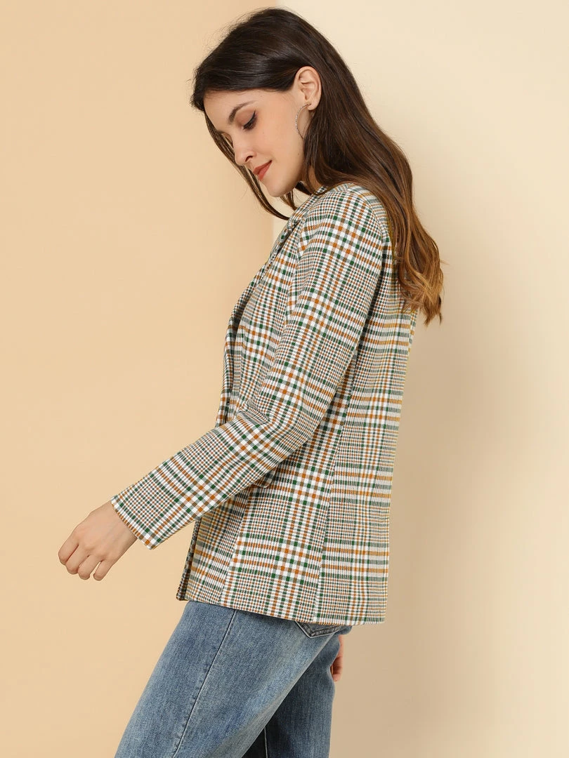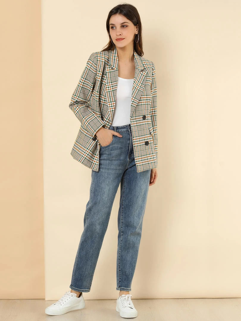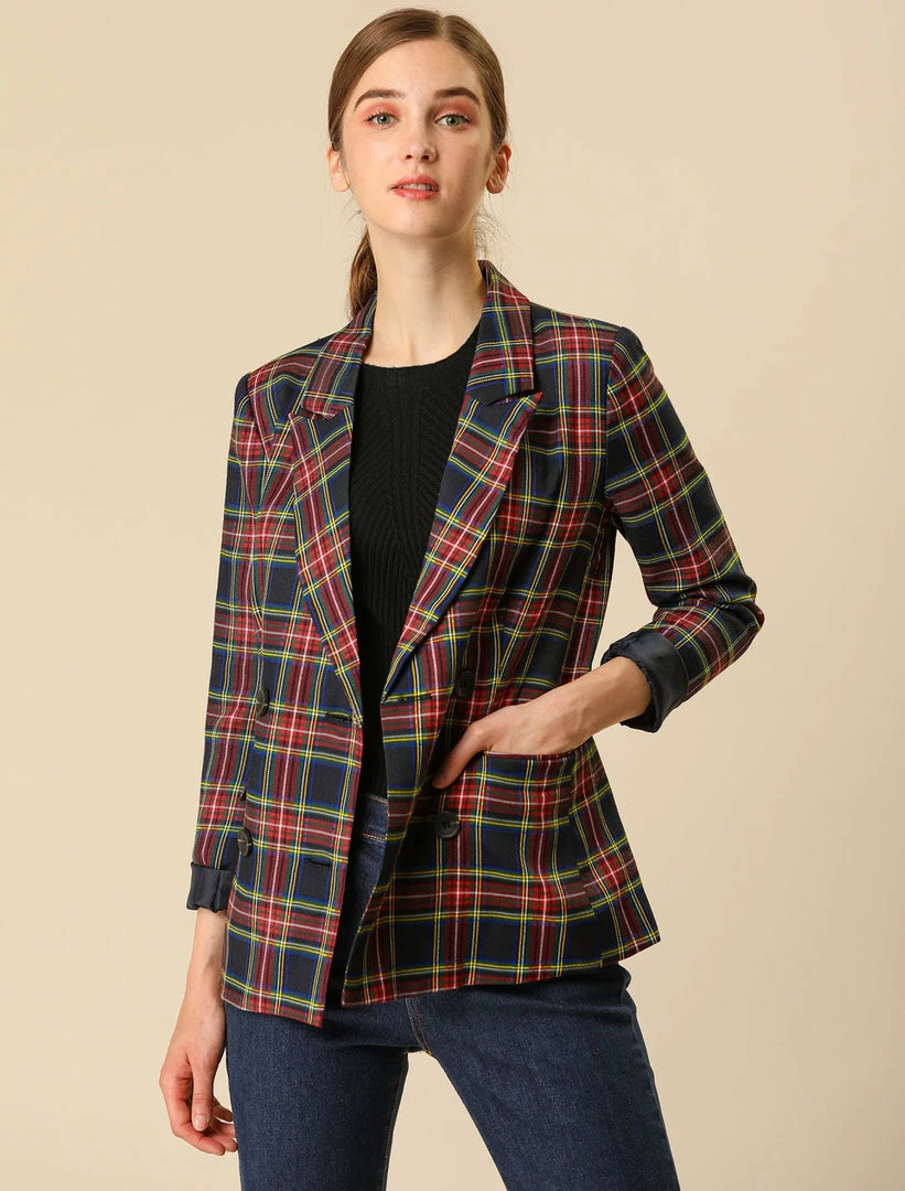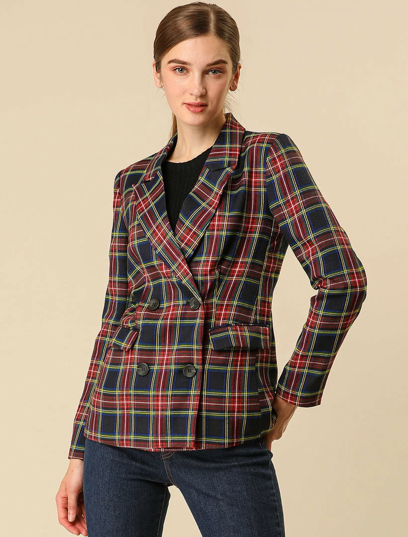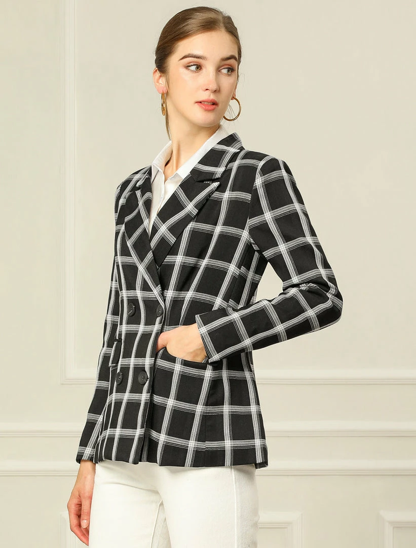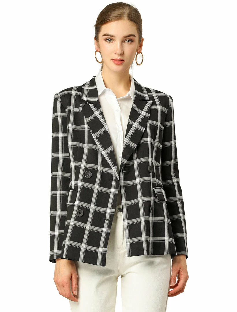 Allegra K Women’s Notched Lapel Double Breasted Plaid Suit Blazer