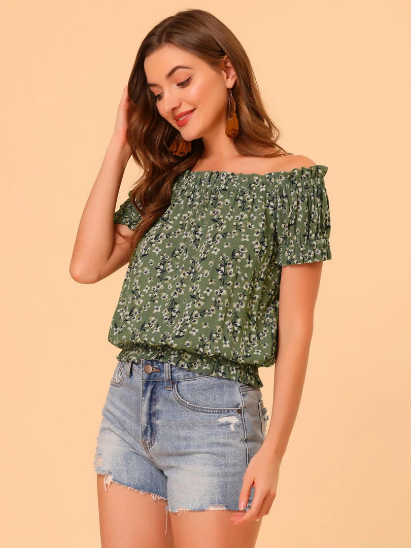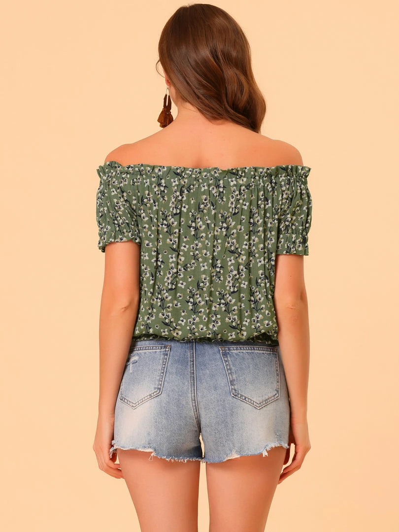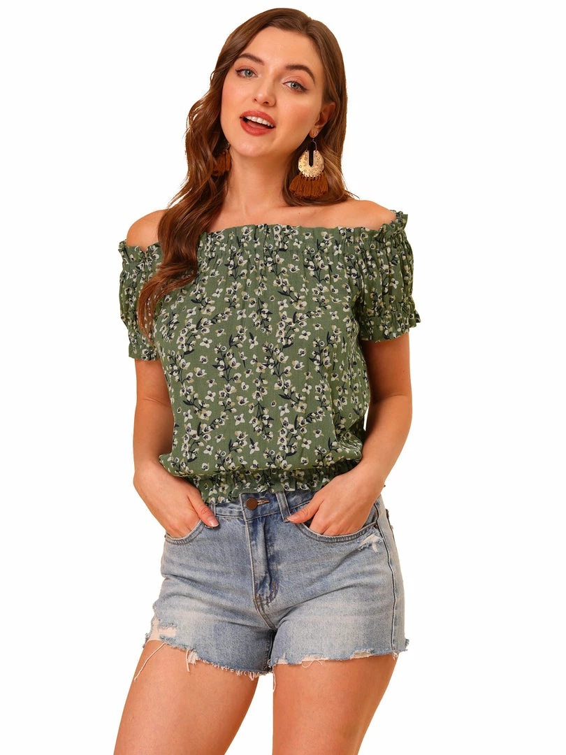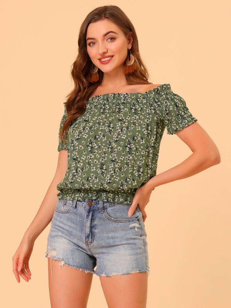 Allegra K Women’s Off Shoulder Cotton Puff Sleeve Elastic Waist Floral Cami Blouse Top