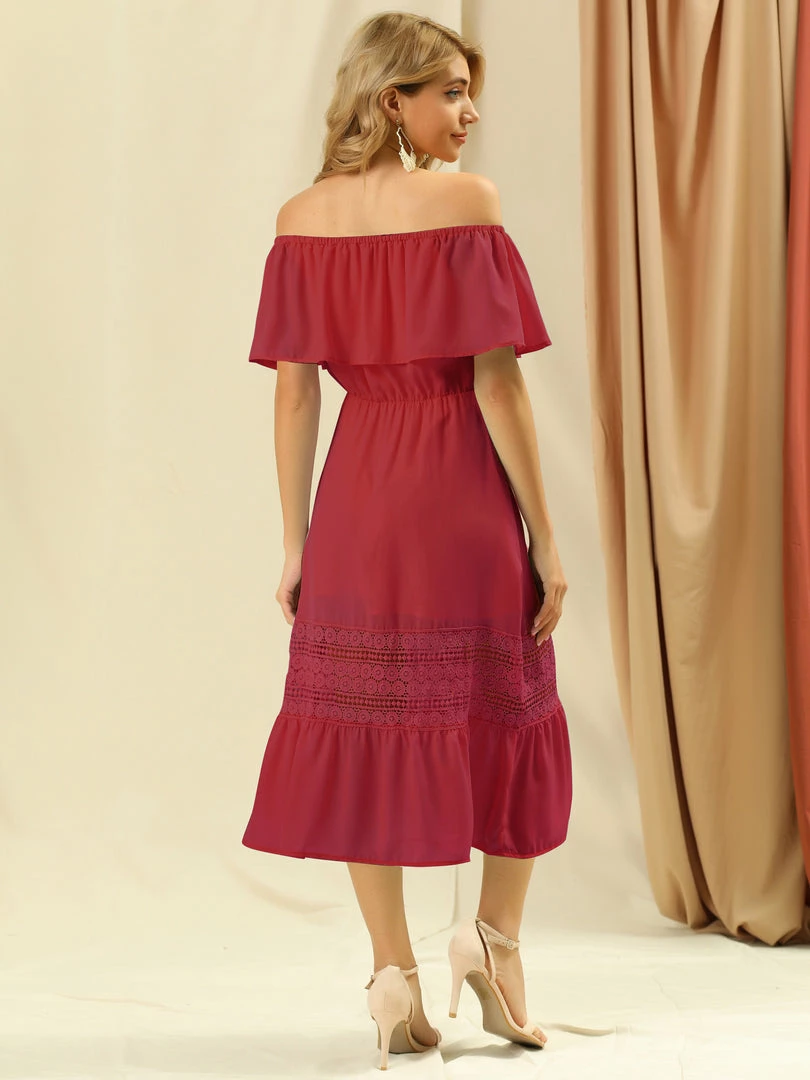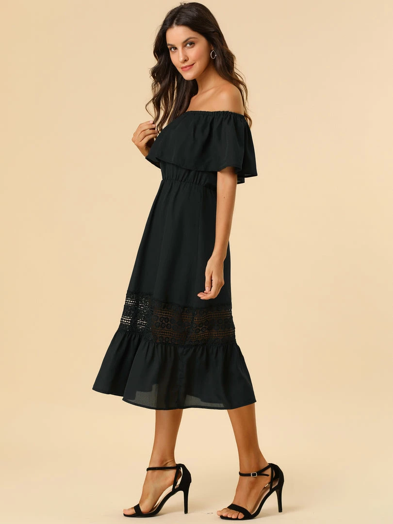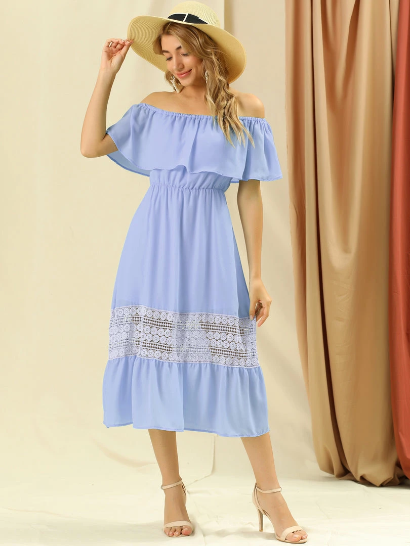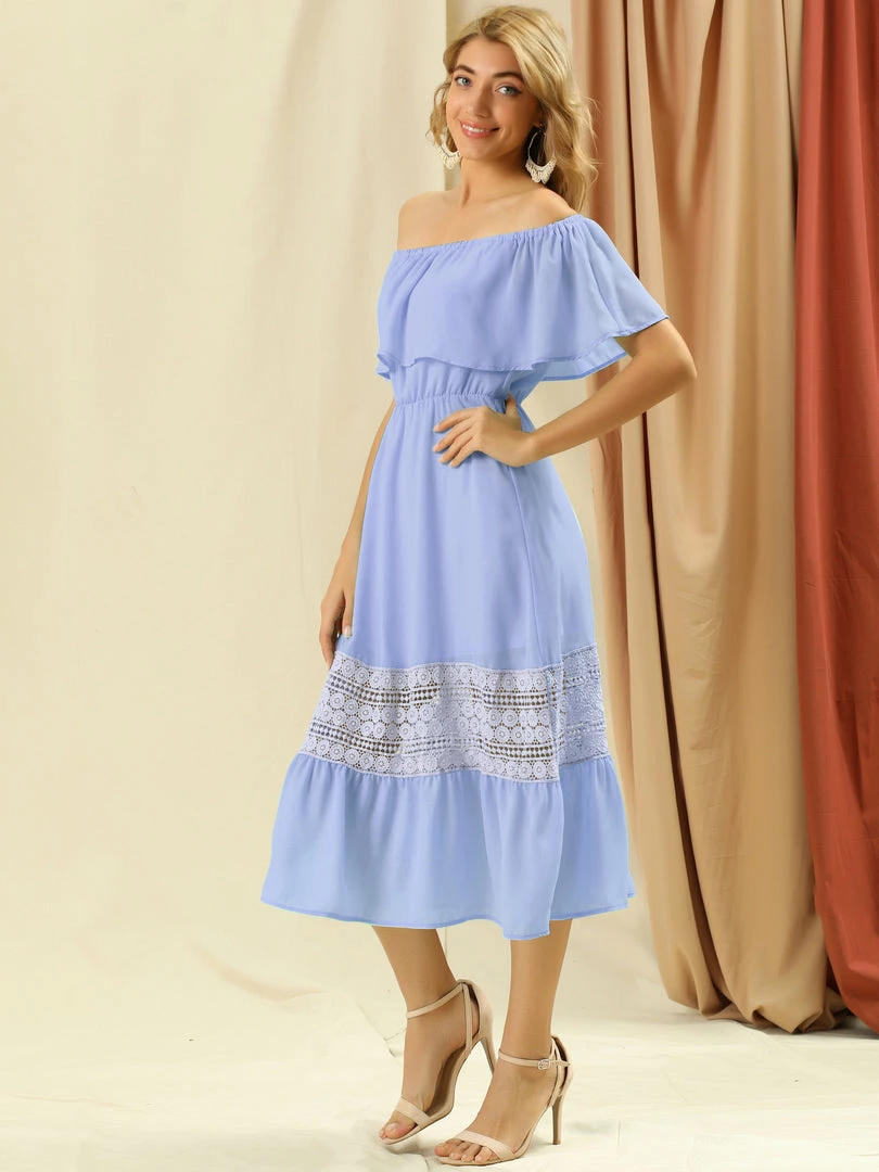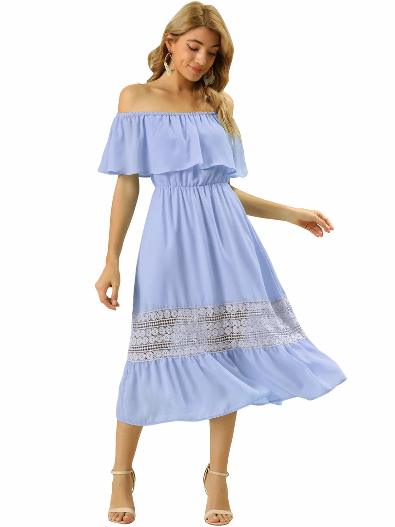 Allegra K Women’s Off Shoulder Ruffle Lace Splicing Flutter Sleeve Maxi Dress
