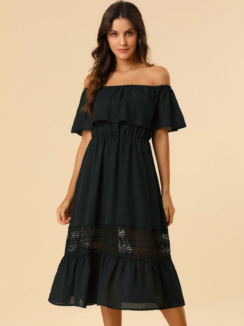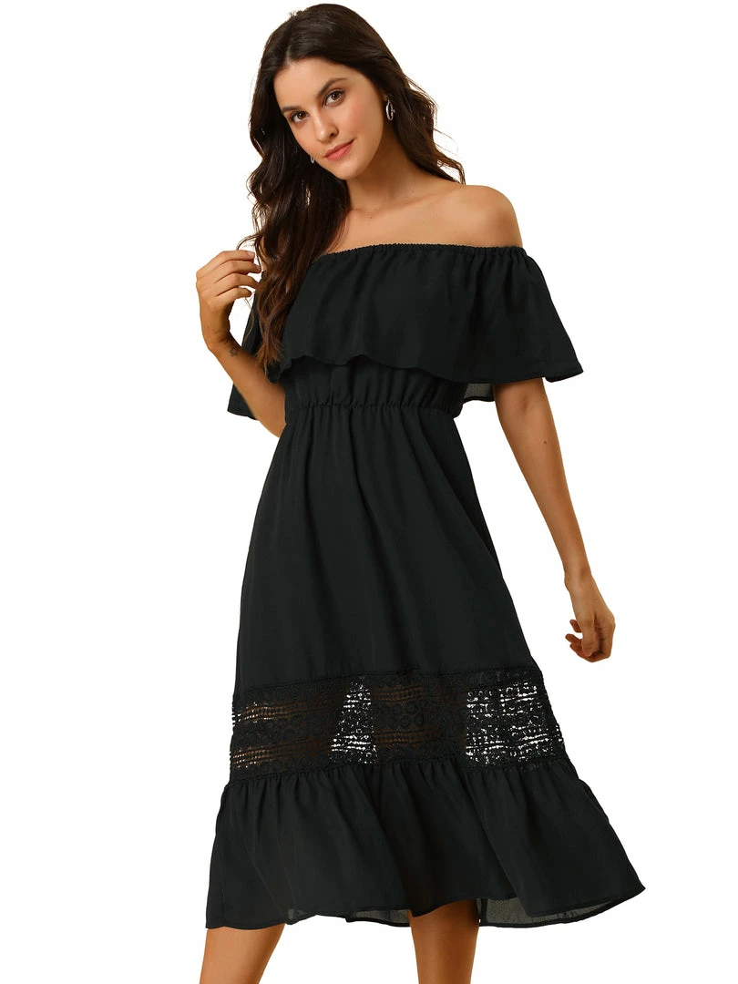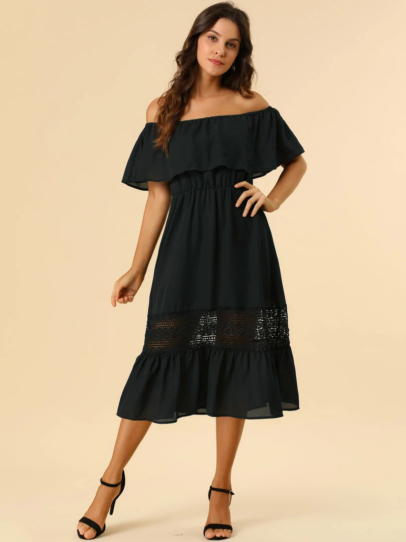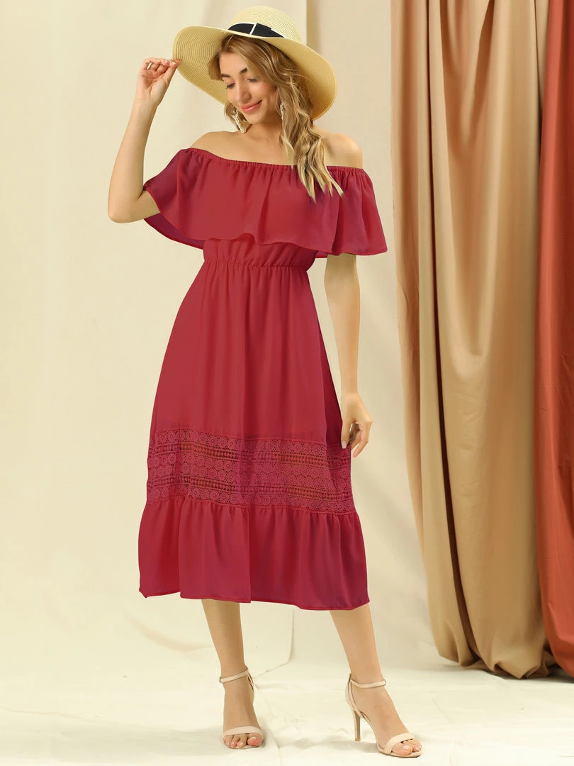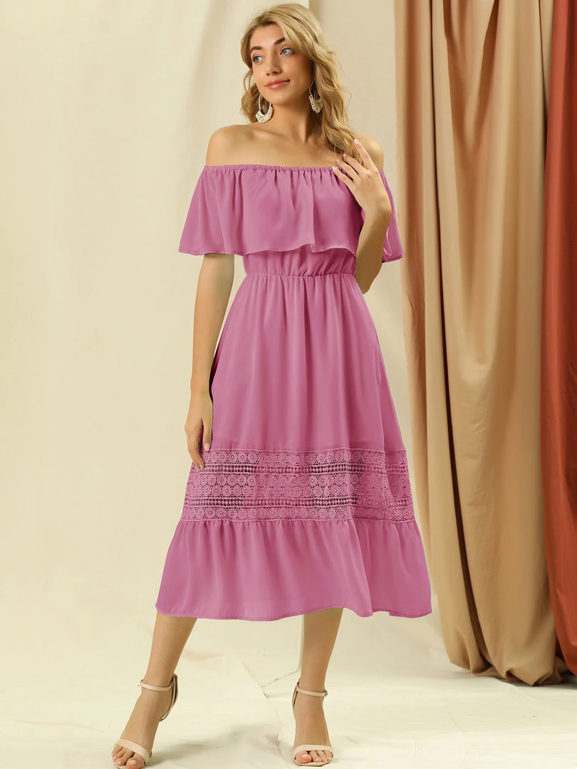 Allegra K Women’s Off Shoulder Ruffle Lace Splicing Flutter Sleeve Maxi Dress