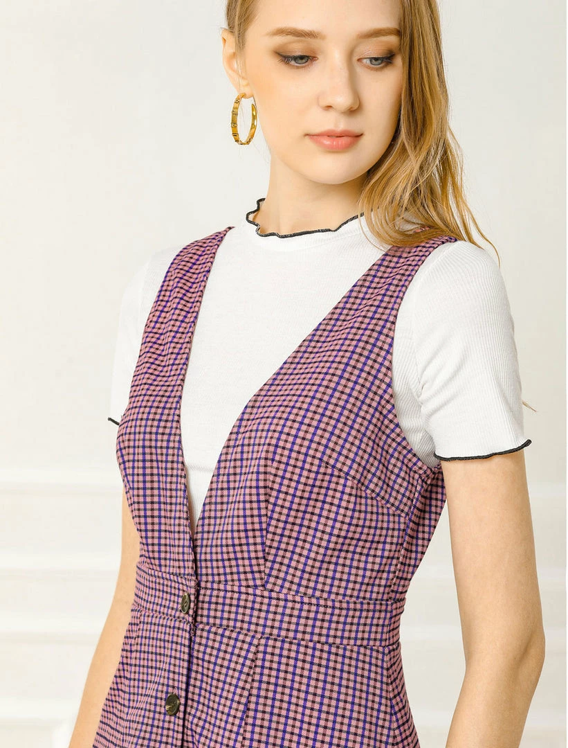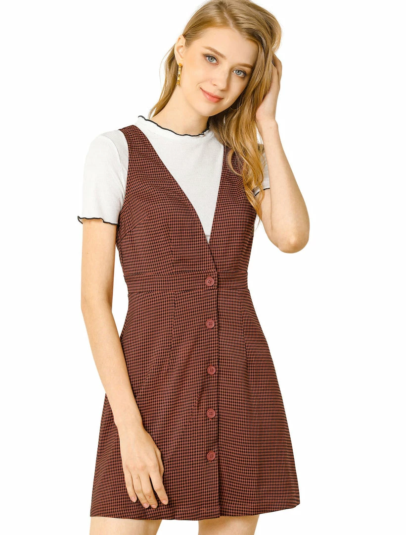 • Women’s pinafore dress with an a-line design and button front detail.