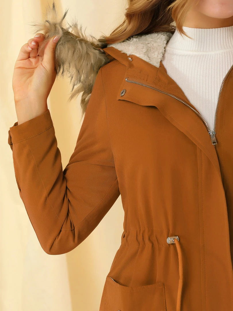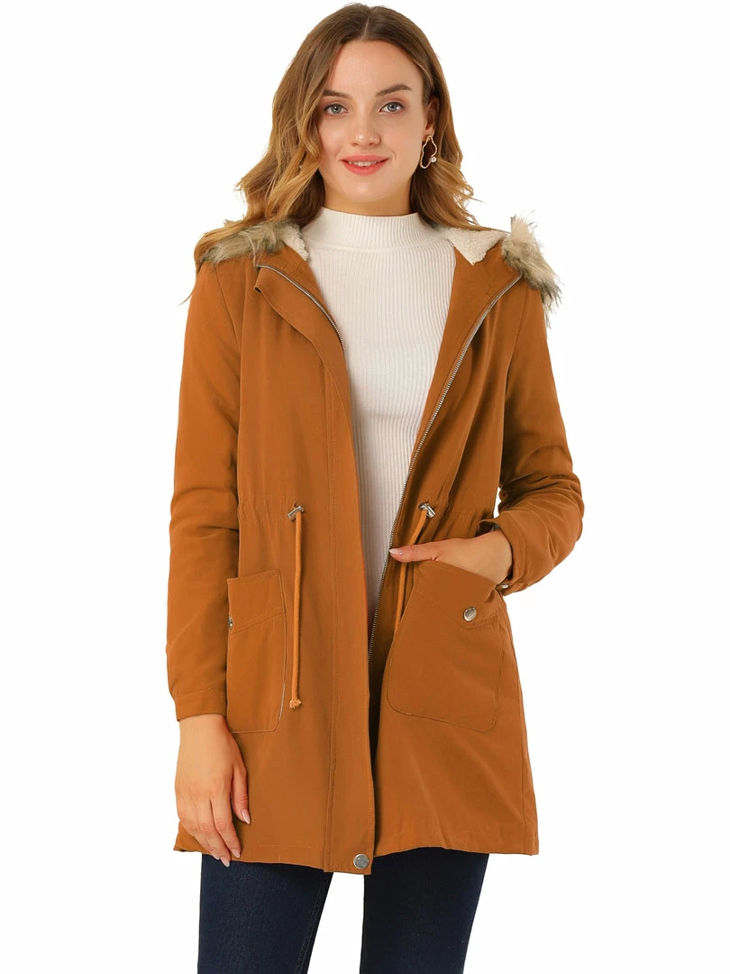 Allegra K Women’s Parka Coat Faux Fur Hooded Tie Wasit Jacket With Pockets