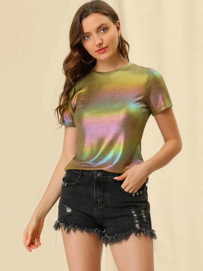 Allegra K Women’s Party Metallic Textured Short Sleeve Shiny Multicolor Top