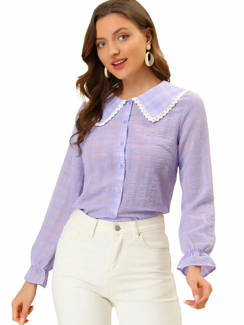 Allegra K Women’s Peter Pan Collar Crochet Trim Sweet Ruffled Cuffs Plain Plaid Blouse Top