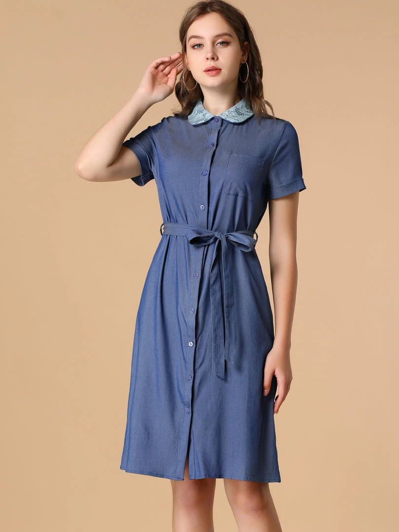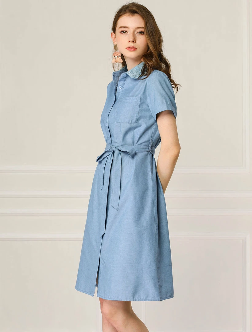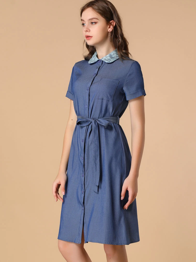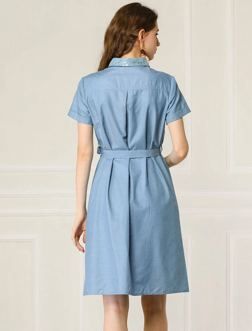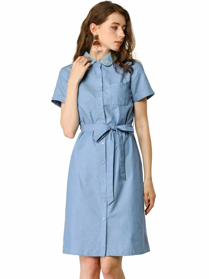 Allegra K Women’s Peter Pan Collar Short Sleeve Belted Shift Chambray Denim Shirt Dress