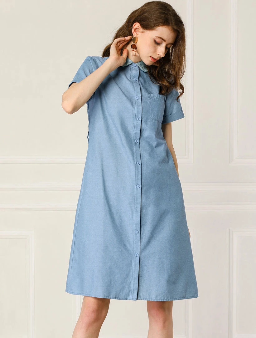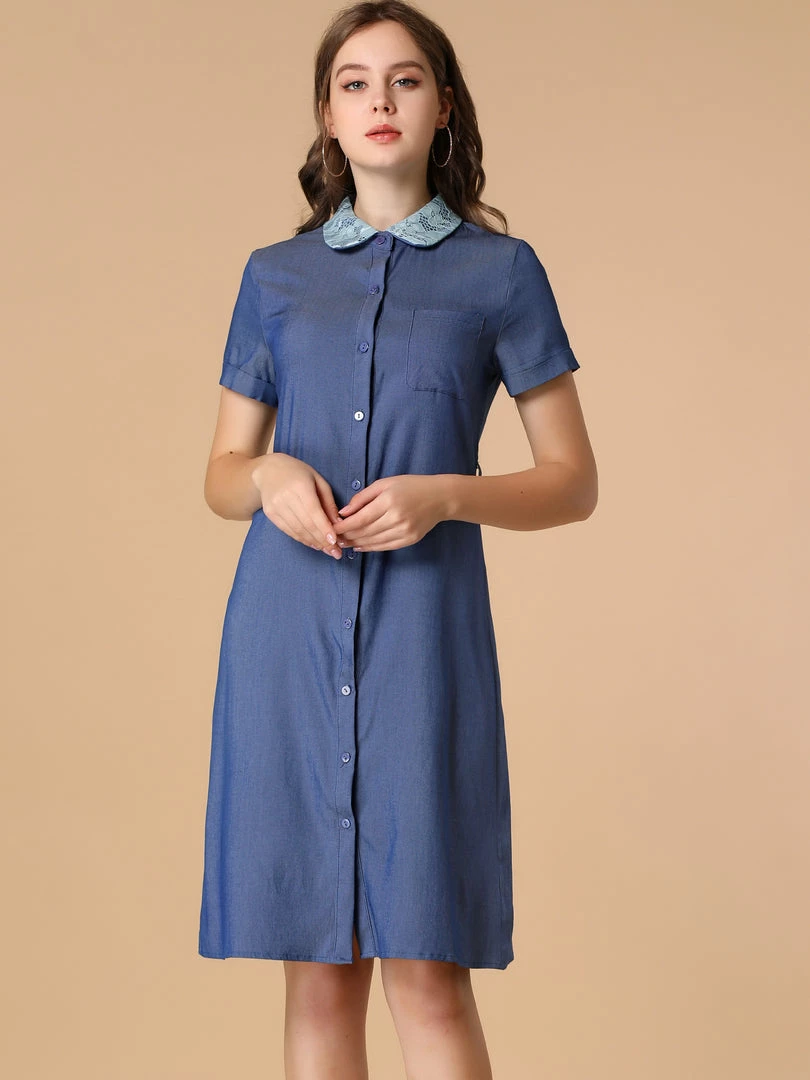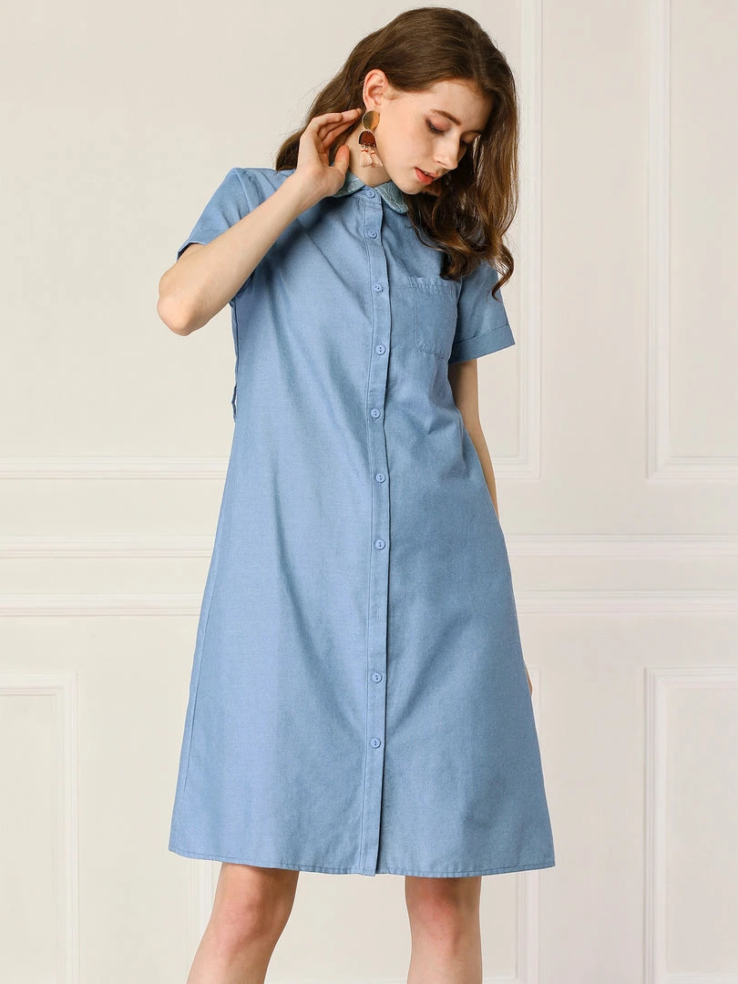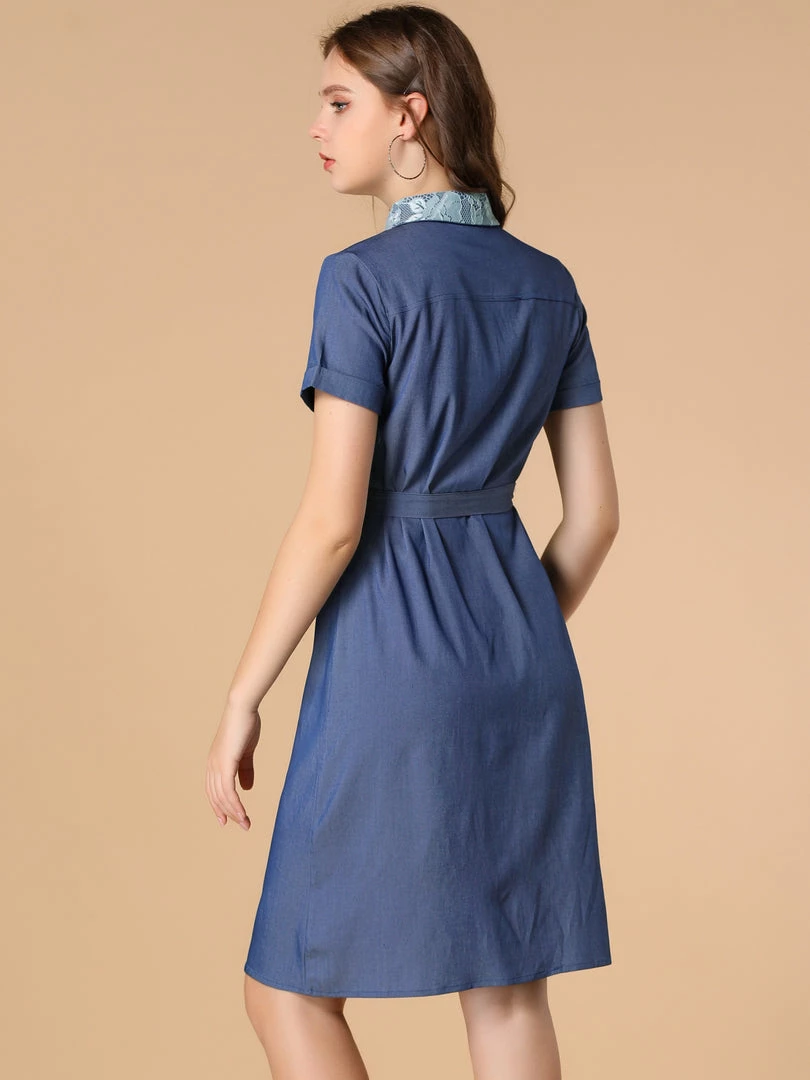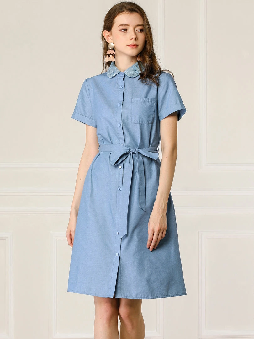 Allegra K Women’s Peter Pan Collar Short Sleeve Belted Shift Chambray Denim Shirt Dress