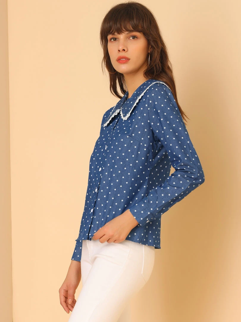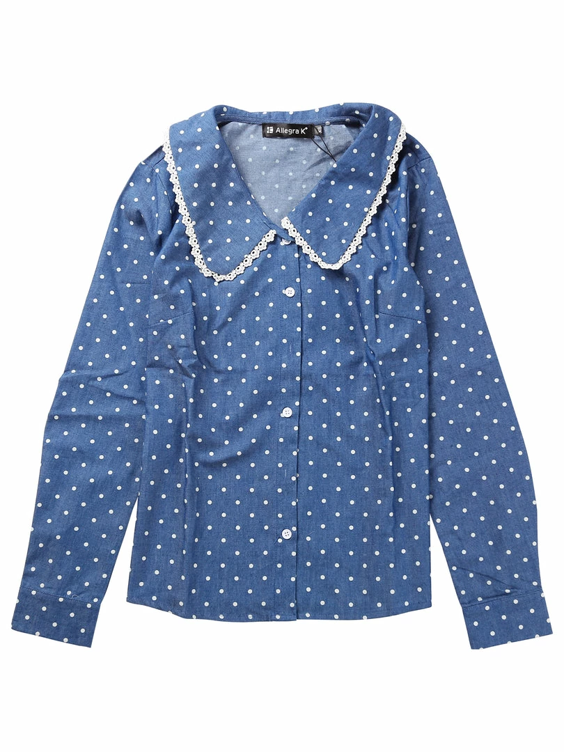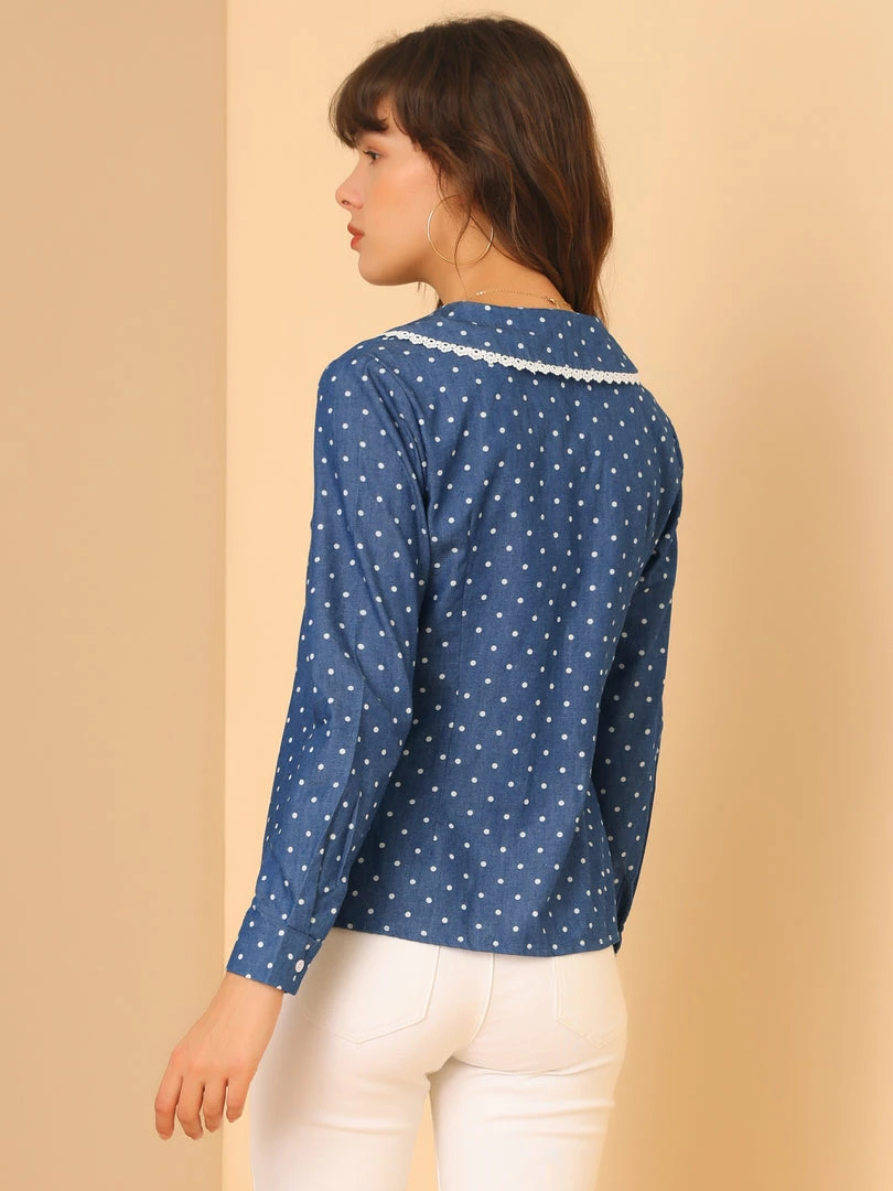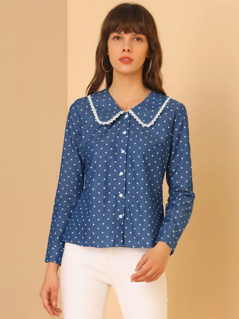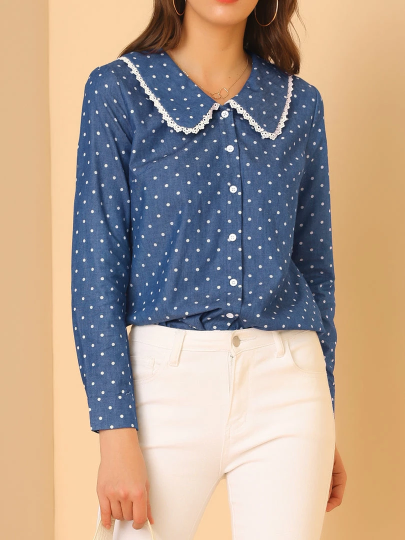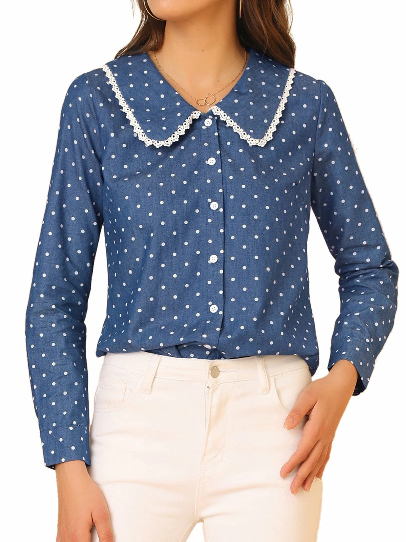 Allegra K Women’s Peter Pan Crochet Trim Collar Button Up Long Sleeve Polka Dots Blouse Shirt