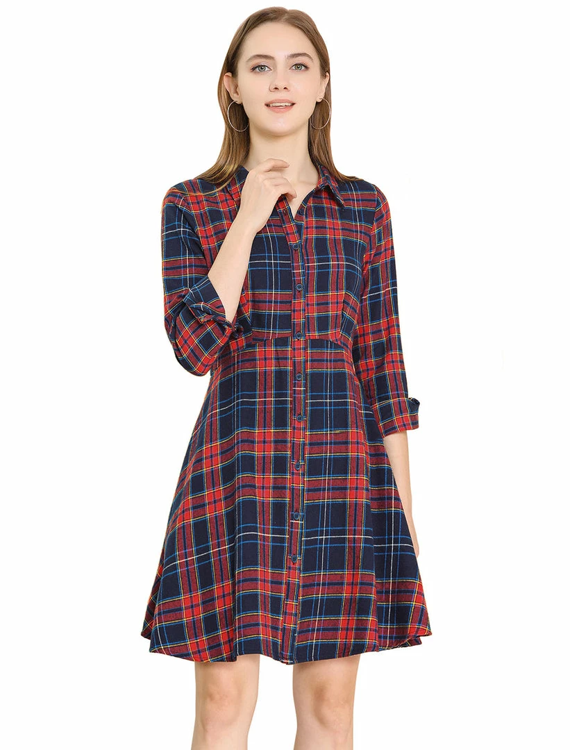 Allegra K Women’s Plaid Button Up Point Collar Fit And Flare Full Placket Tunic Dress Long Sleeve Turndown Collar