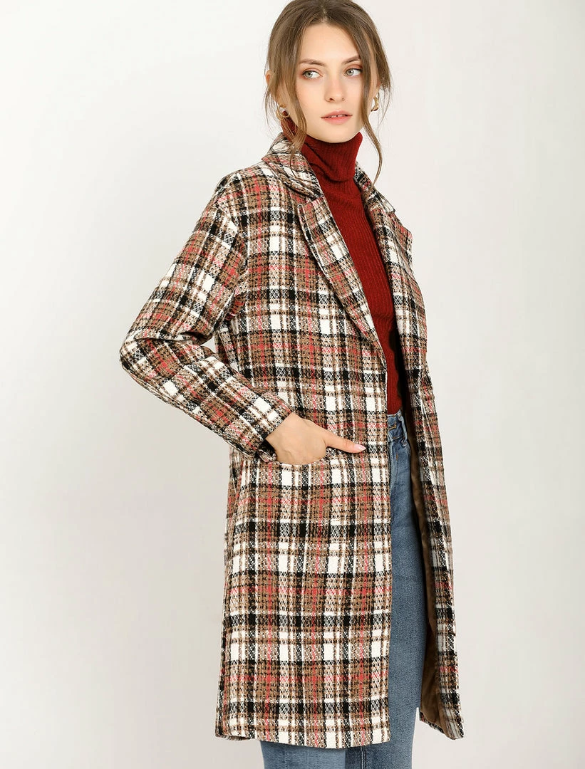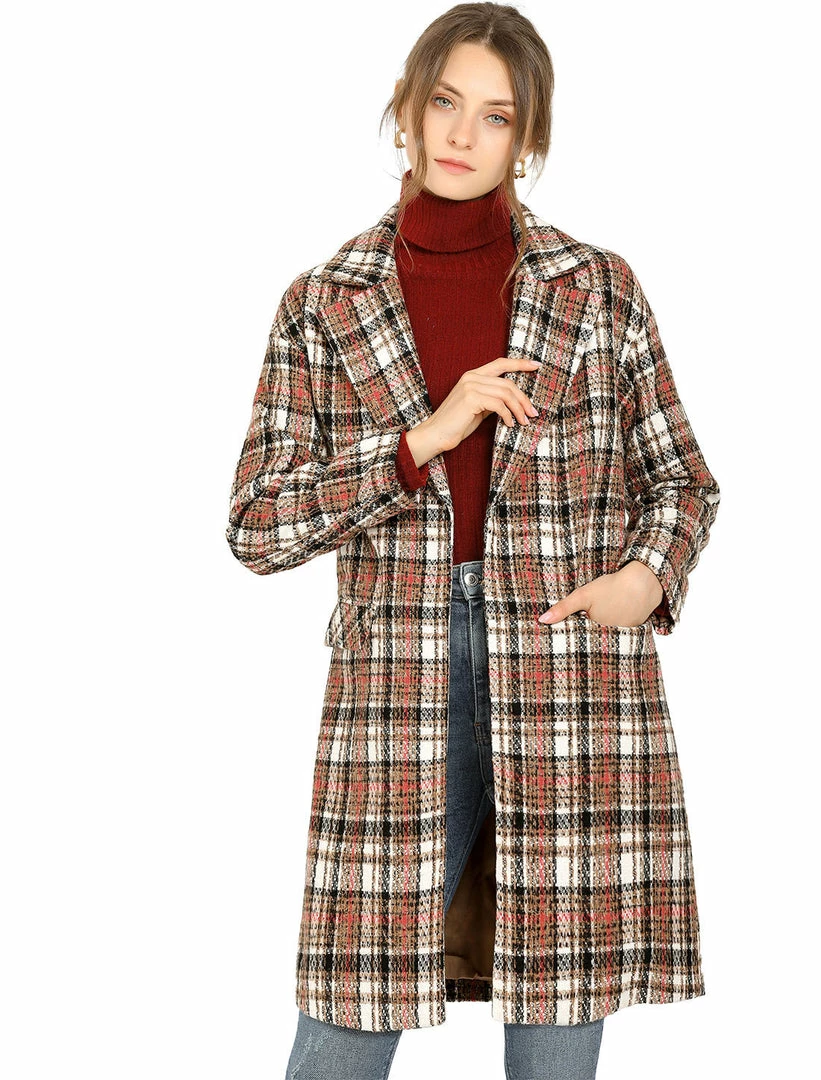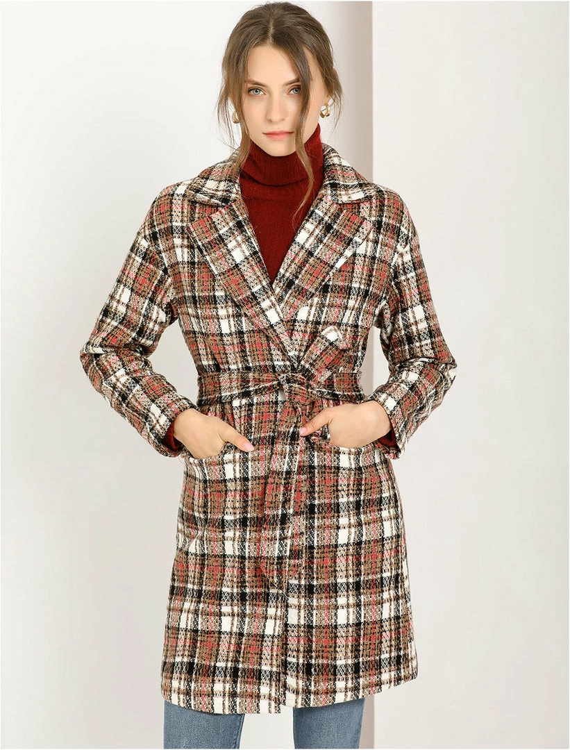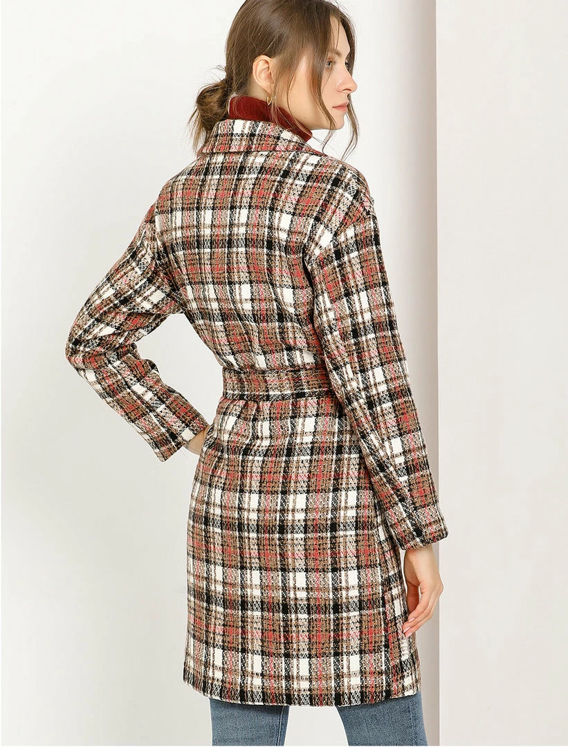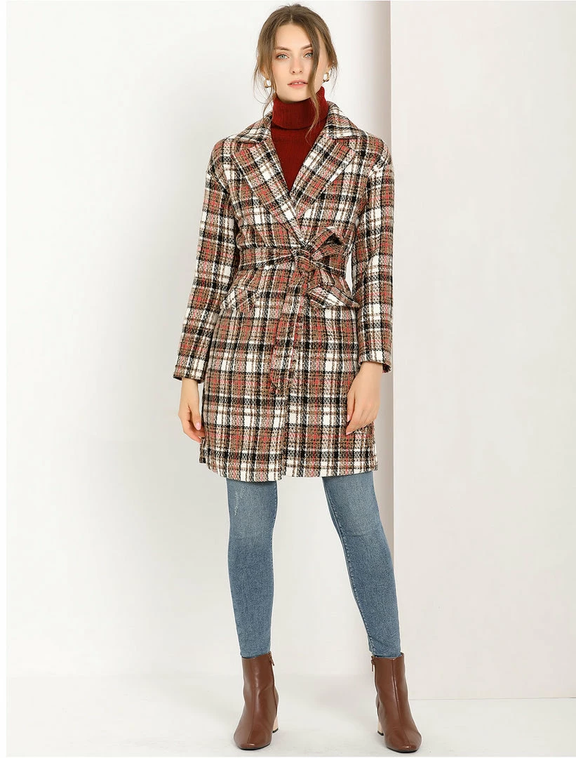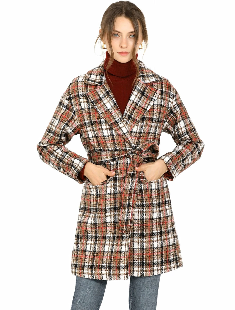 Allegra K Women’s Plaid Cardigan Notch Lapel Open Front Trench Pea Coat Outerwear With Belt