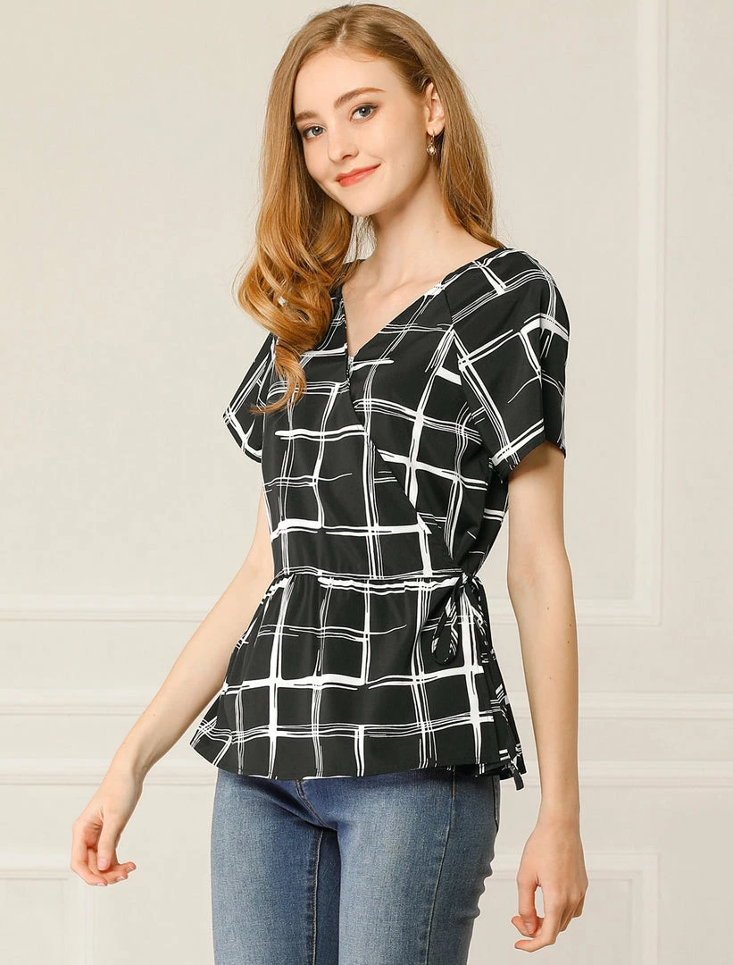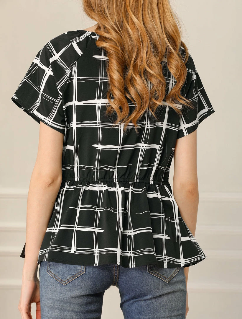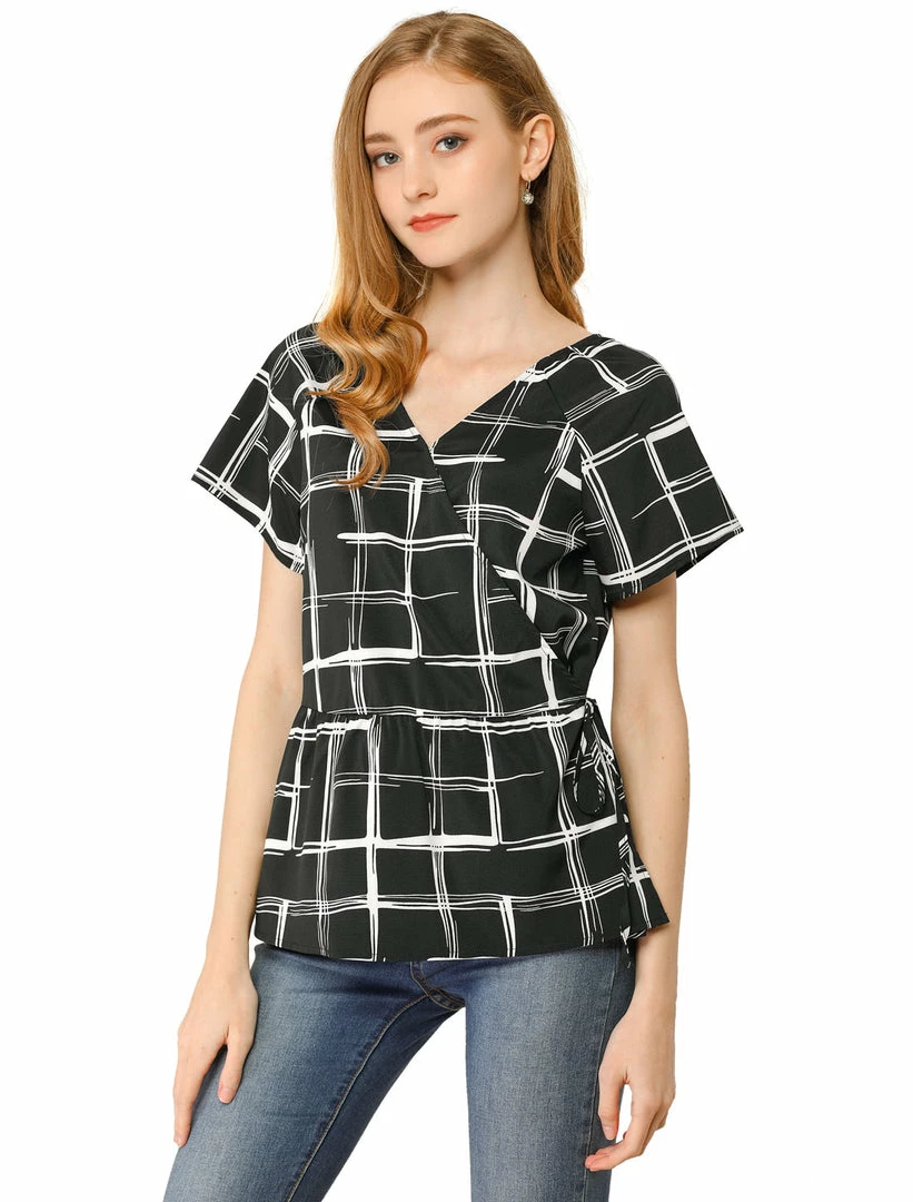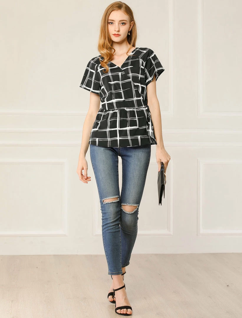 Allegra K Women’s Plaid Drawstring Waist Short Sleeve V-neck Wrap Peplum Top