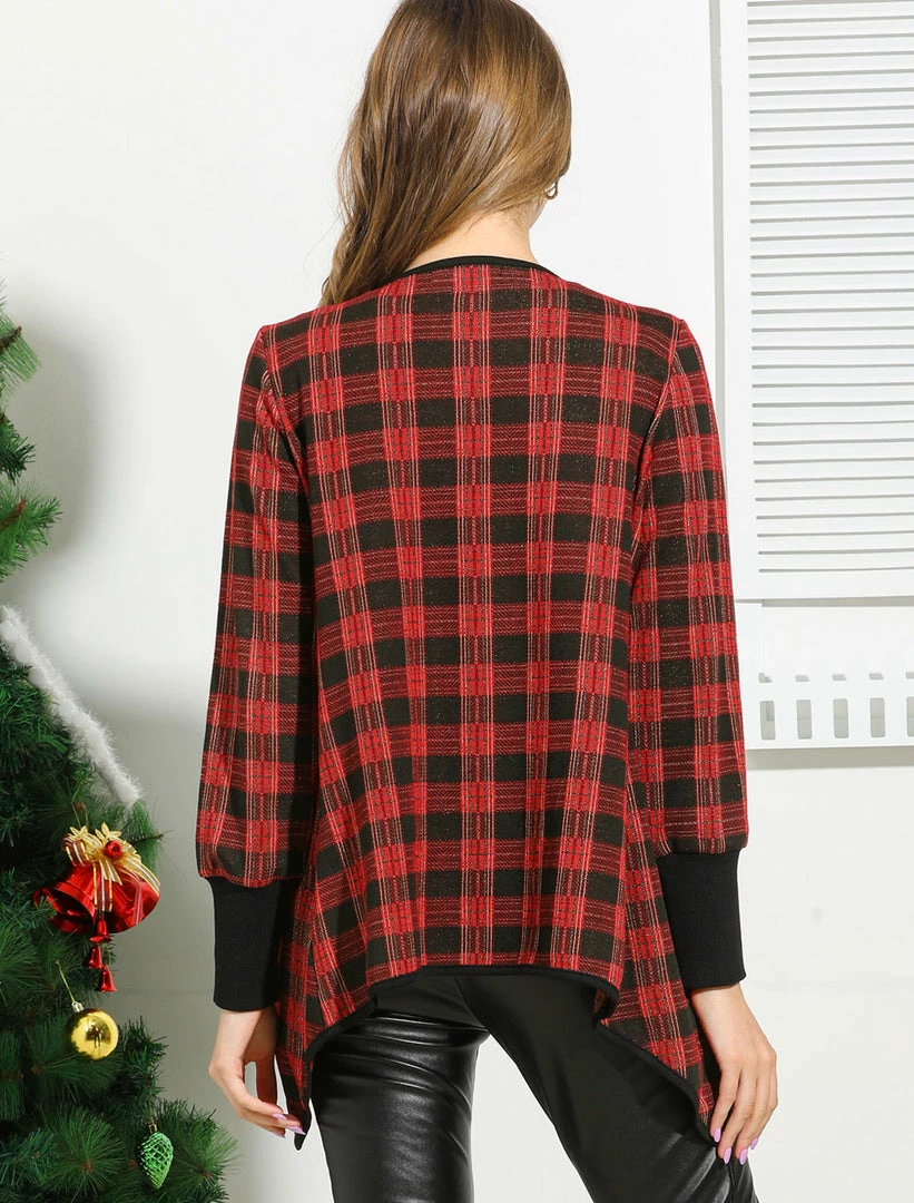 - Shiny plaid makes a modern statement on this open-front cardigan.