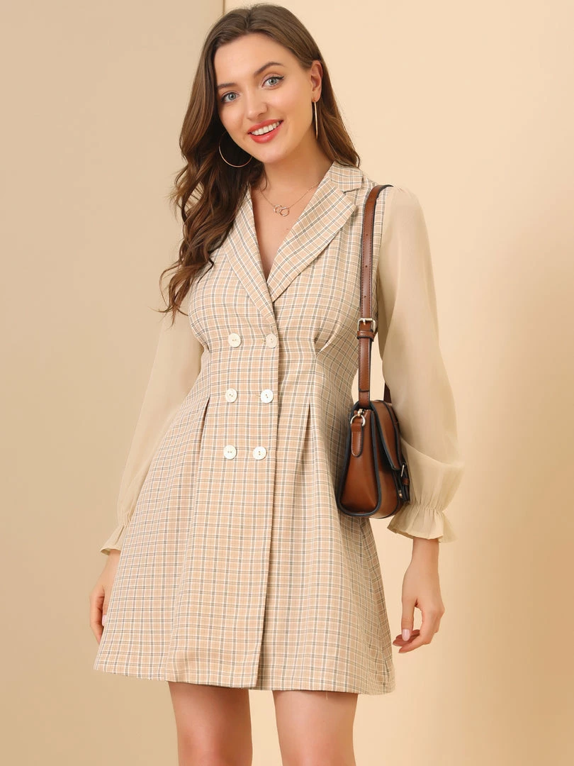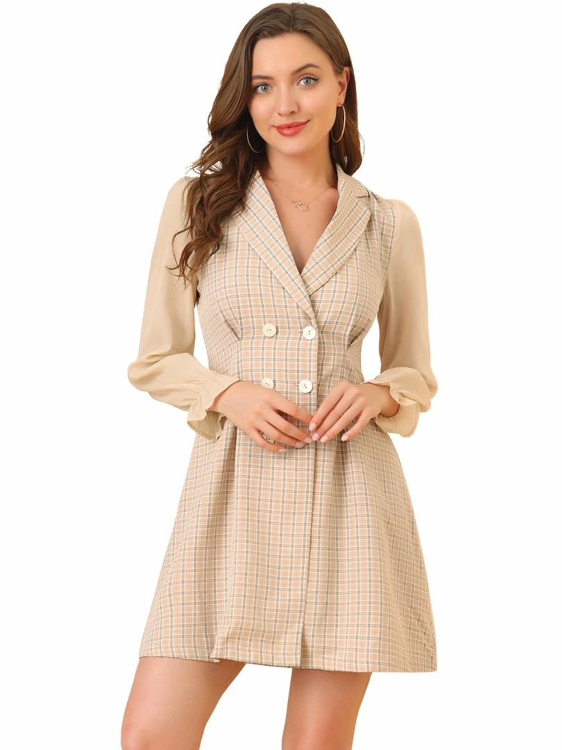 Allegra K Women’s Plaid Notched Lapel Double Breasted Elastic Cuff Elegant Long Sleeve Blazer Dress