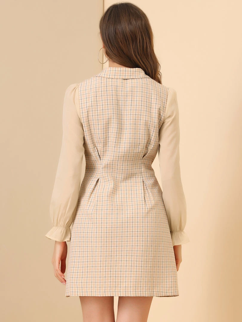 - Blazer Dress, Plaid, Notched Lapel, Elastic Cuff, Contrast Long Sleeve, Button-Front, Above Knee.
