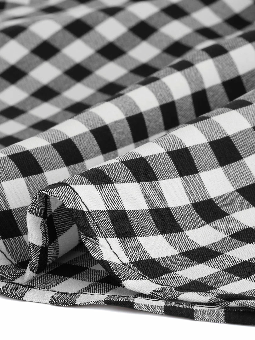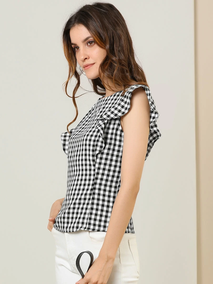 Allegra K Women’s Plaid Shirt Flutter Sleeve Boat Neck Ruffle Work Office Blouse