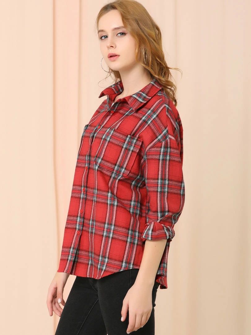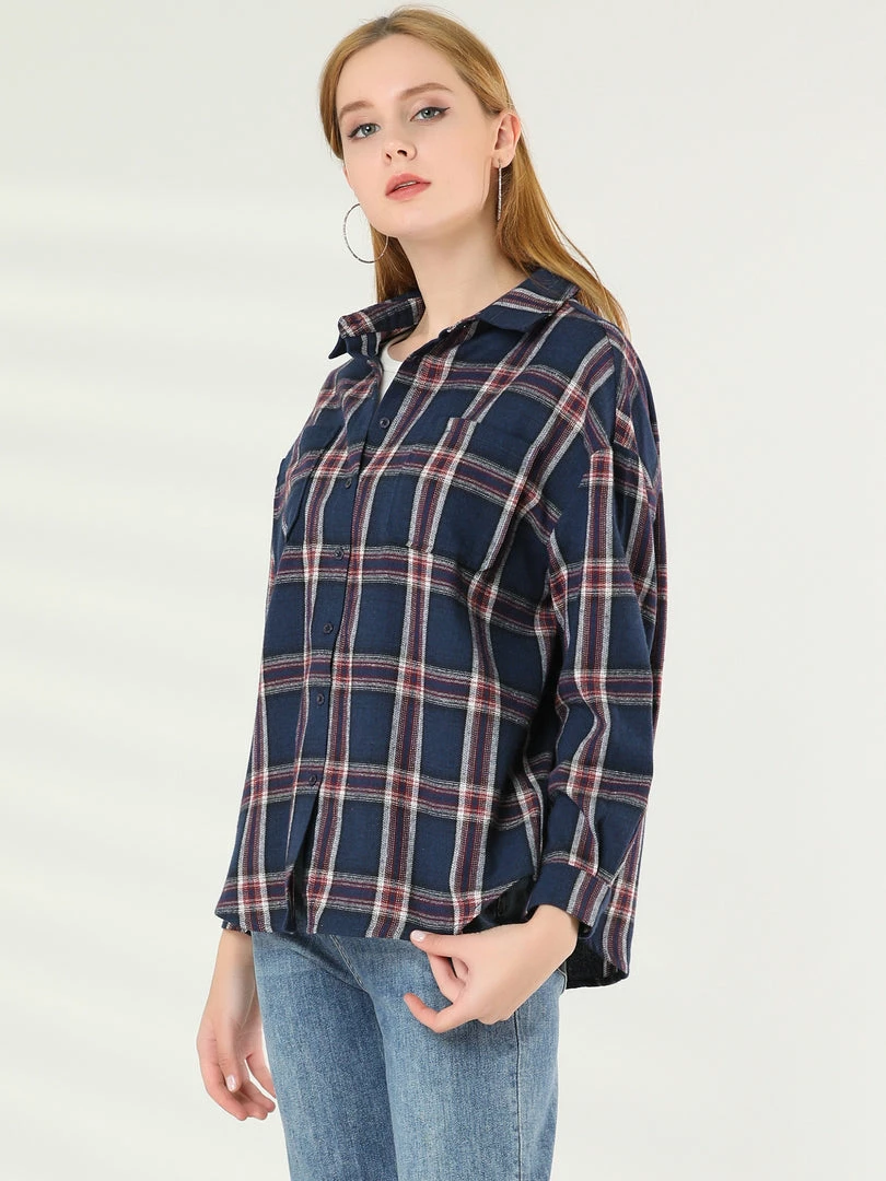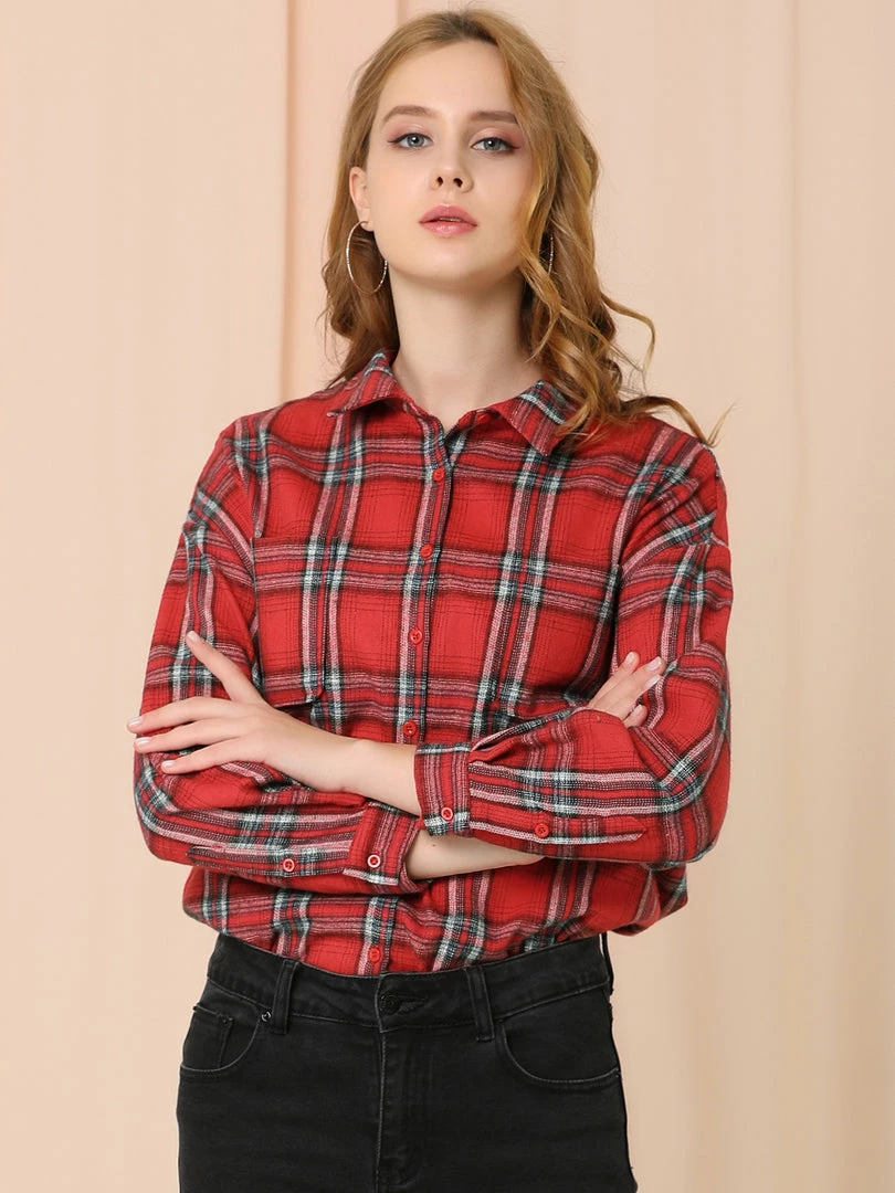 Allegra K Women’s Plaid Shirts Button Down Long Sleeve Pockets Oversized Tunics Blouse
