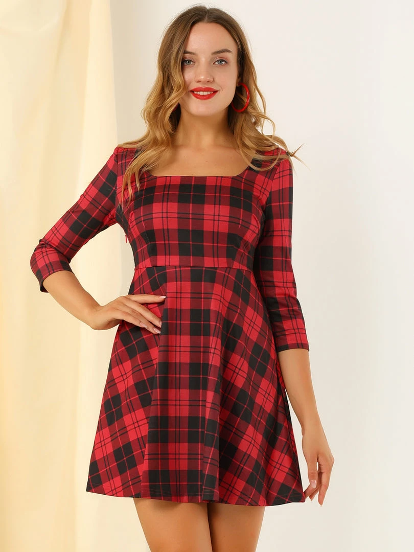 Allegra K Women’s Plaid Square Neck Short Sleeve Dress