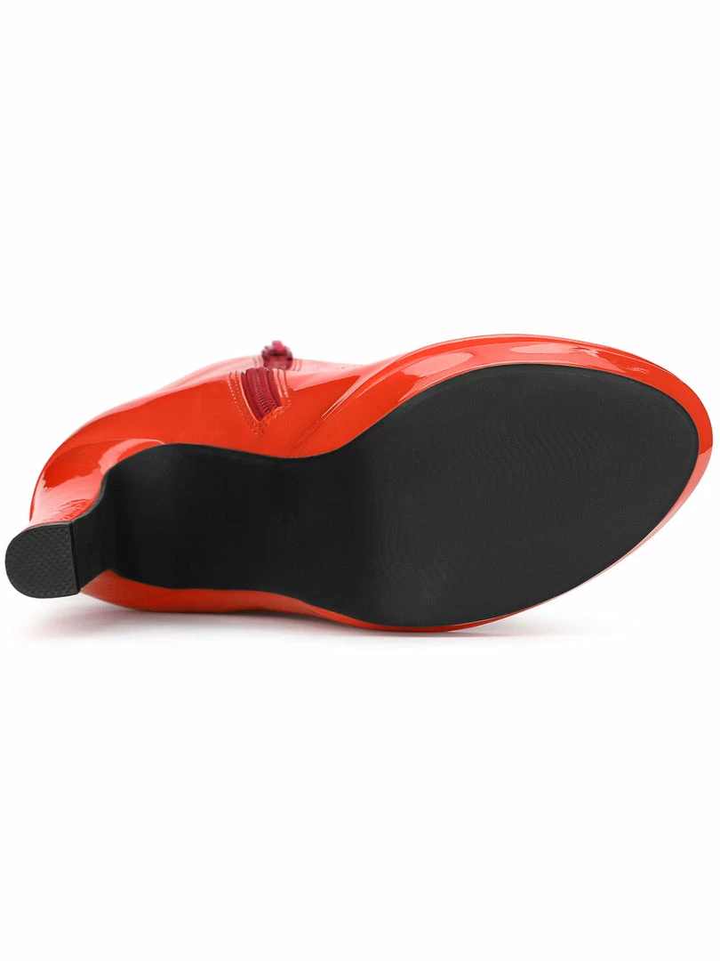 These round toe chunky heel platform ankle boots with patent decor are cute trendy and fashionable, make your ankles and thighs more graceful, showing a nice look with long legs.