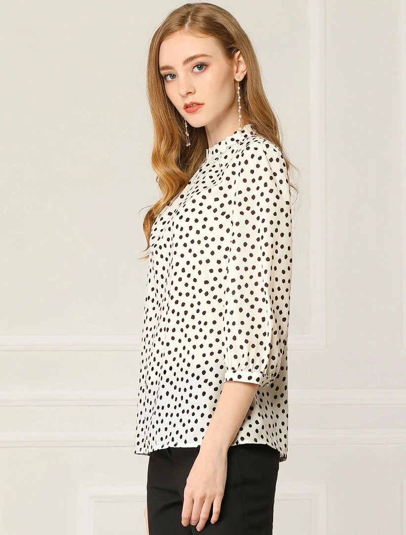 Allegra K Women’s Pleated Neck 3/4 Sleeve Casual Office Dot Print Blouse Top