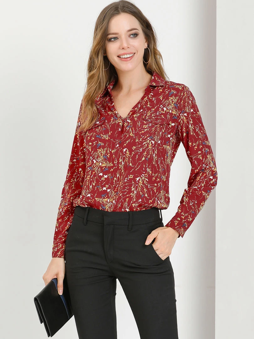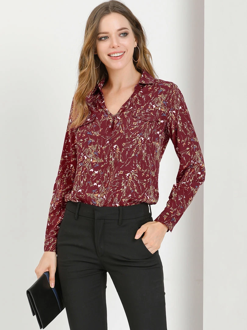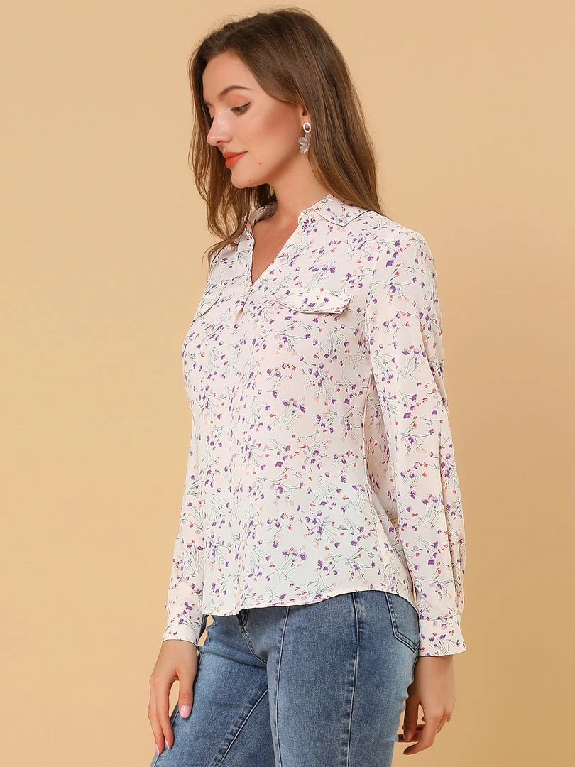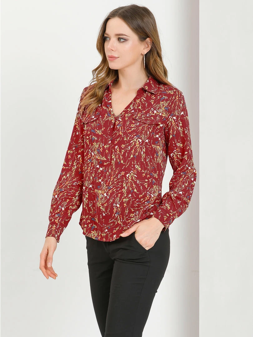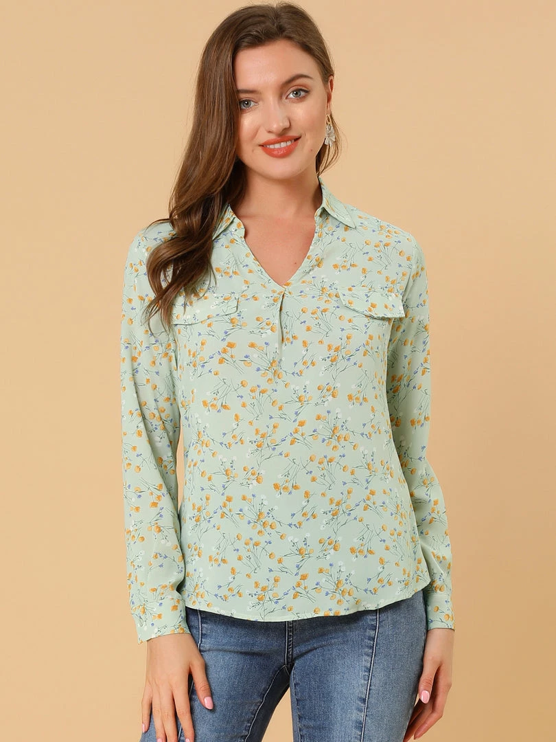 Allegra K Women’s Pleated V-neck Long Sleeve Floral Faux Pocket Shirt Blouse