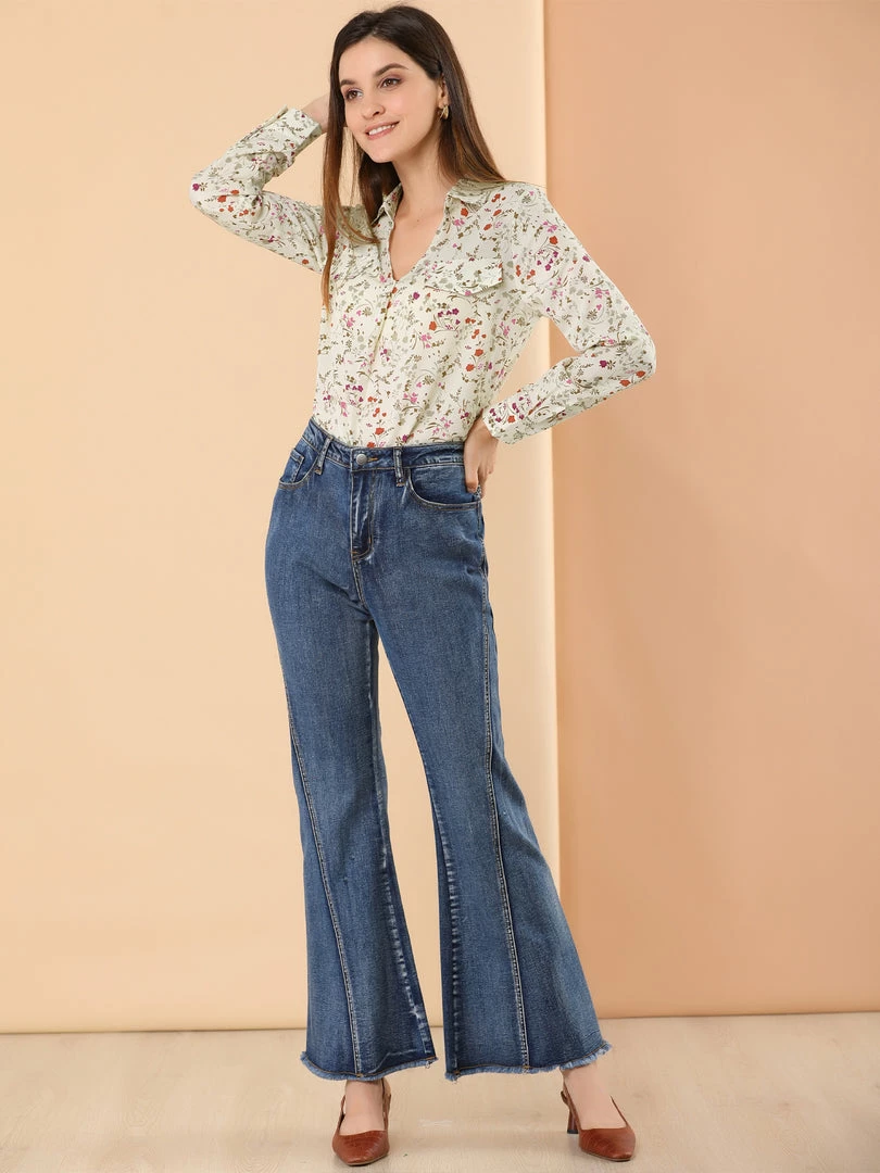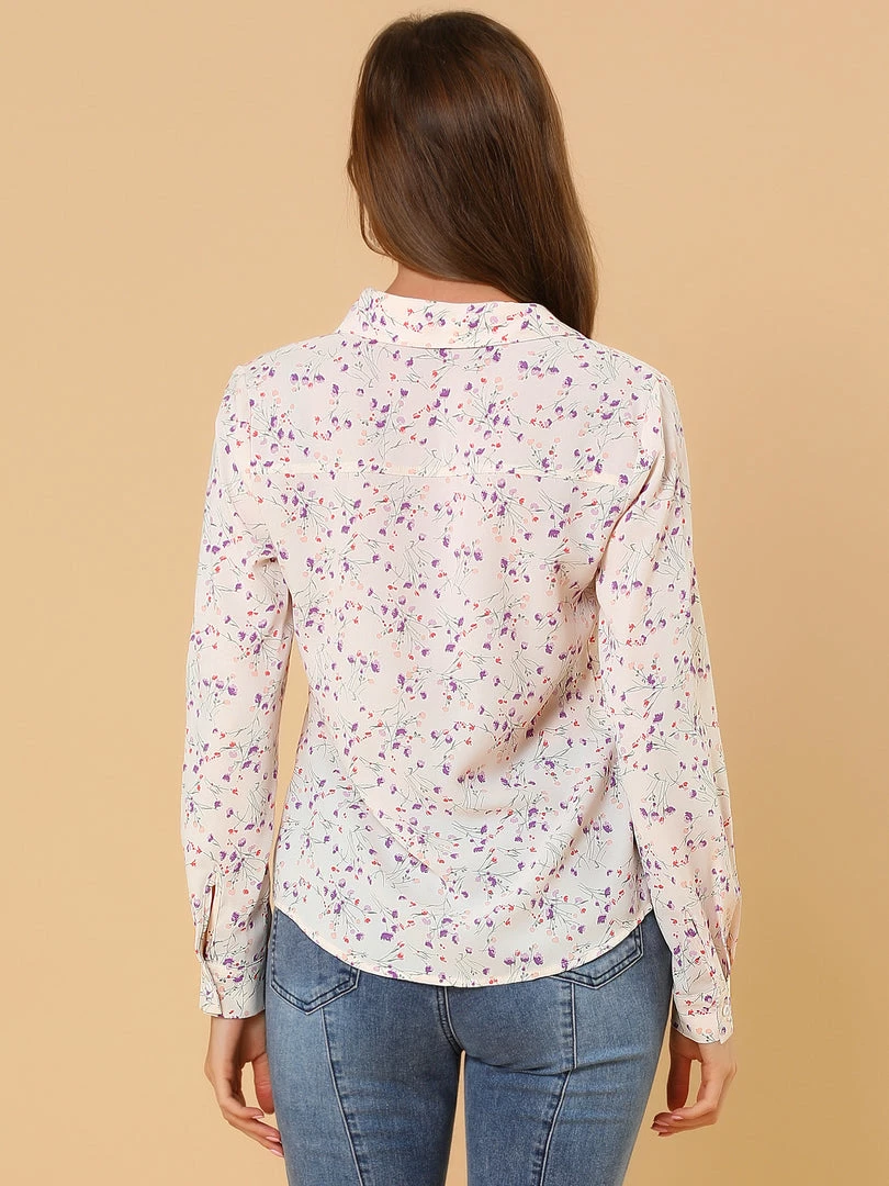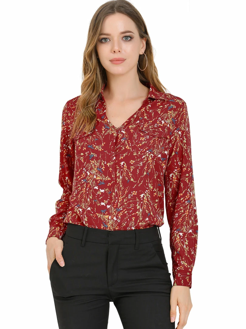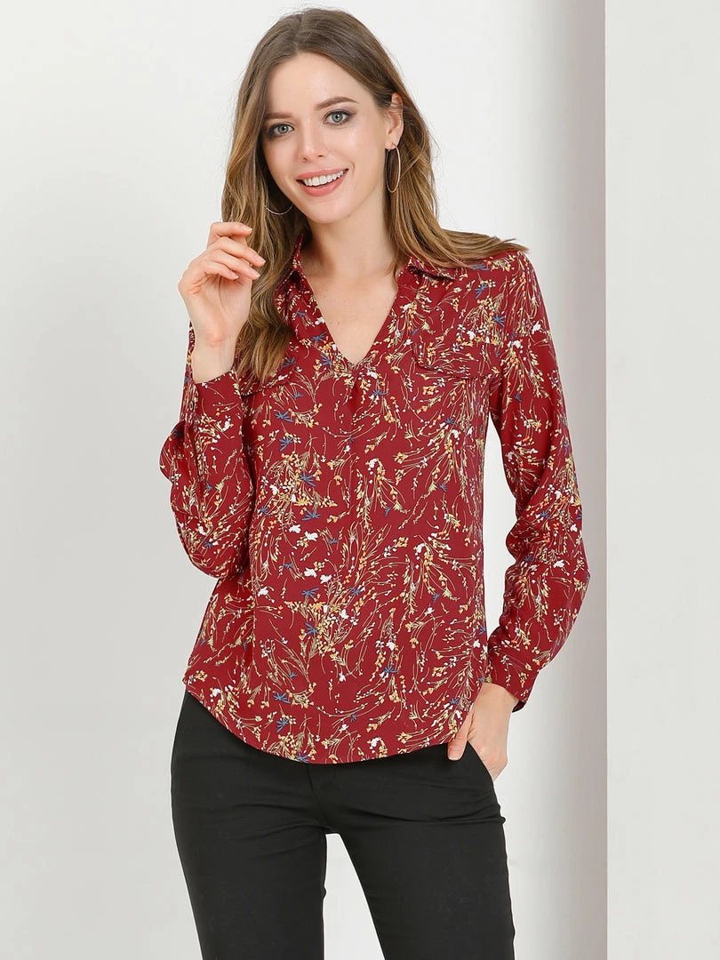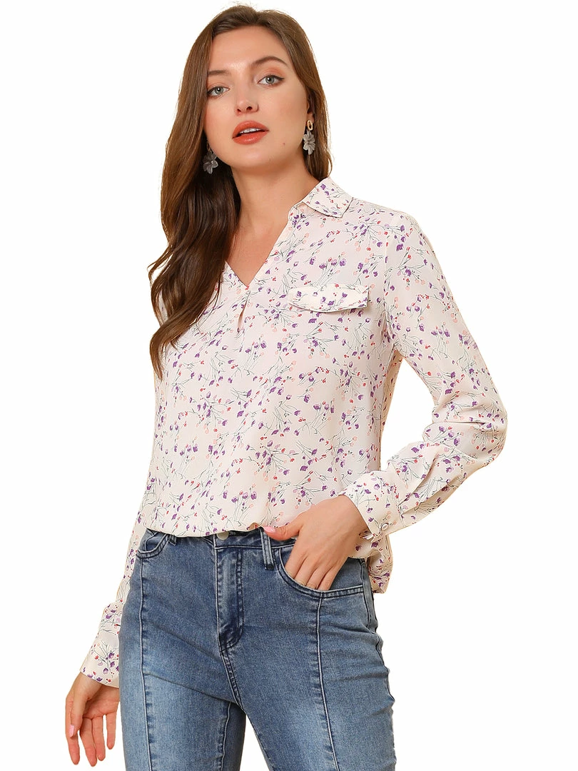 Allegra K Women’s Pleated V-neck Long Sleeve Floral Faux Pocket Shirt Blouse