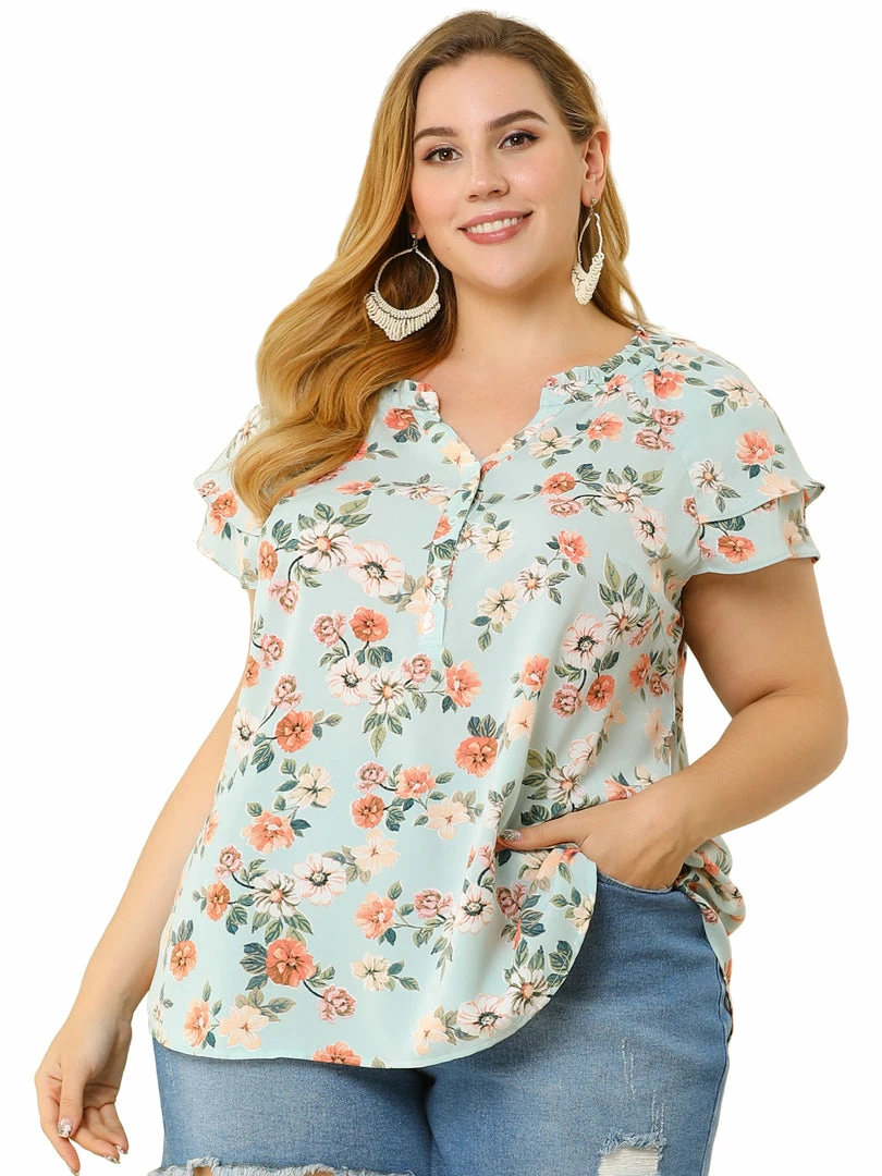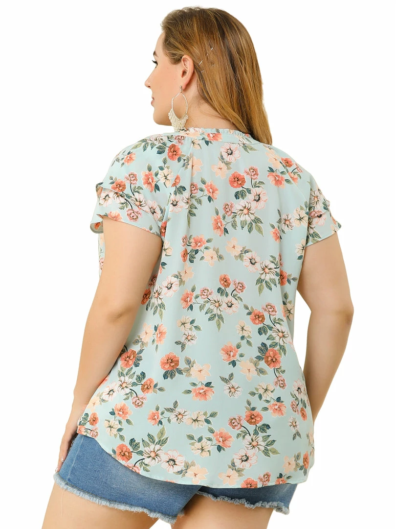 Allegra K Women’s Plus Size Tops Floral Printed Ruffle Trim V Neck Layered Sleeve Blouse