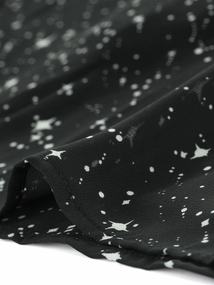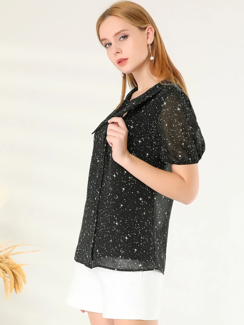 - Stars Dots Printed, Point Collar with Bow Tie, Keyhole, Button Front, Semi Sheer Fabric with Lined Front.