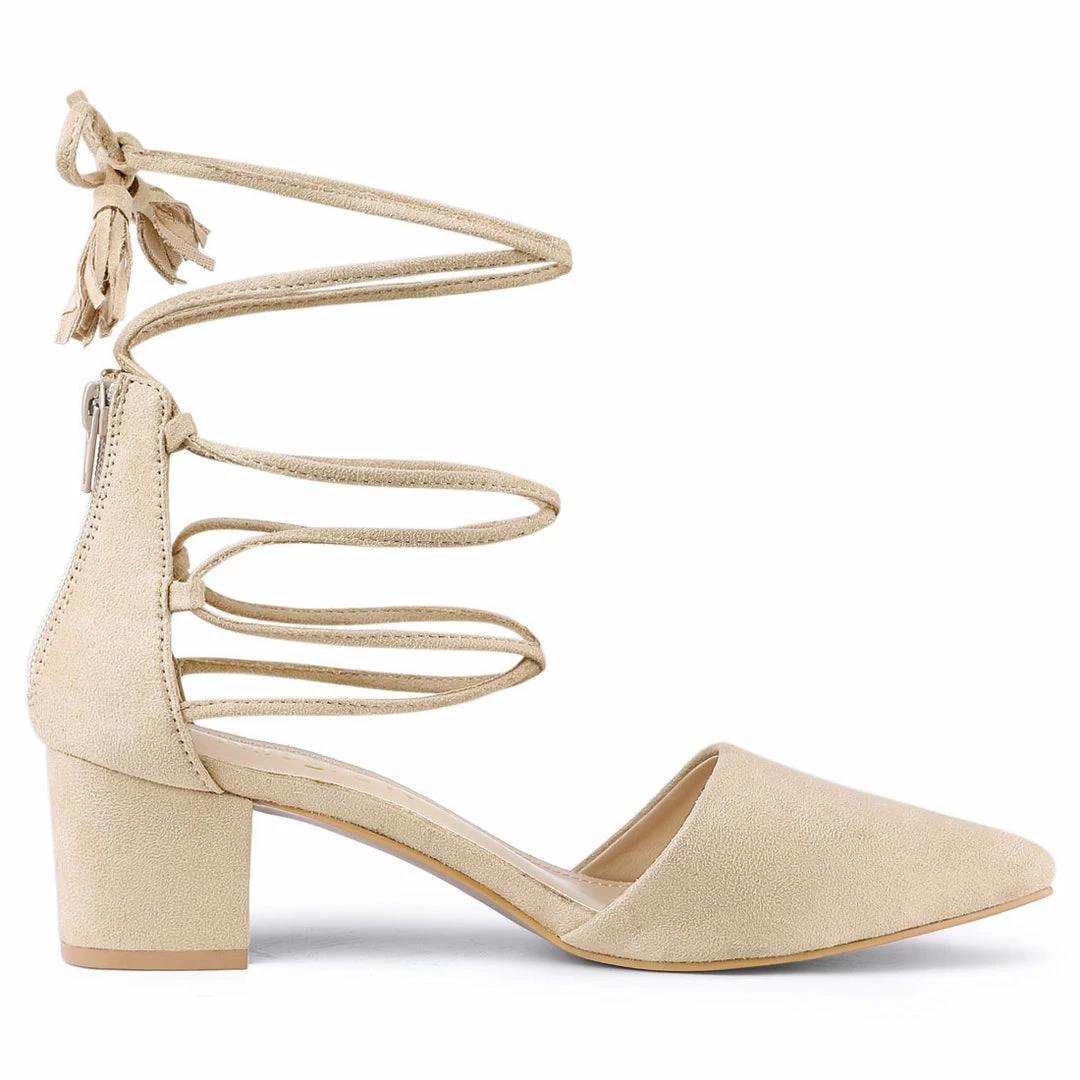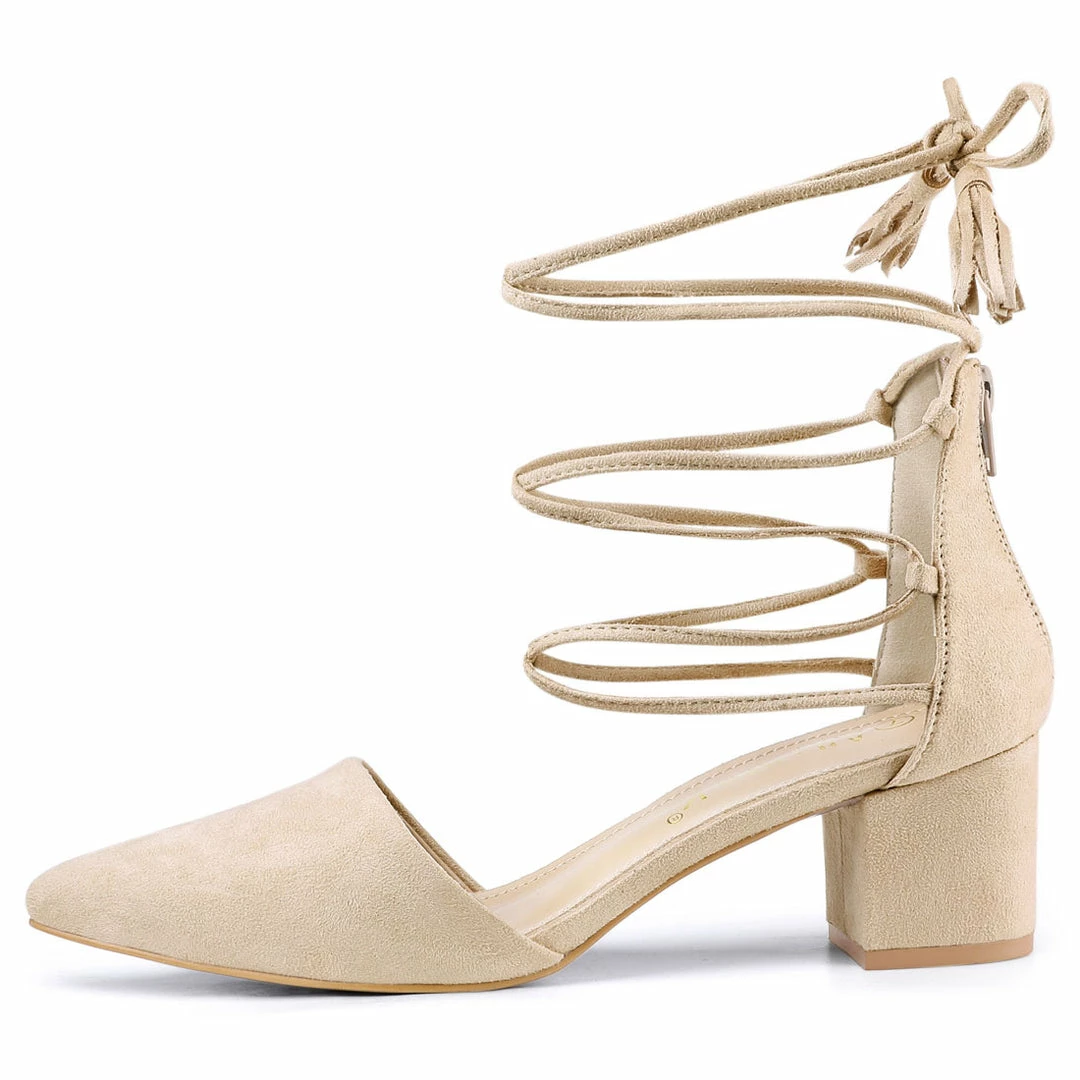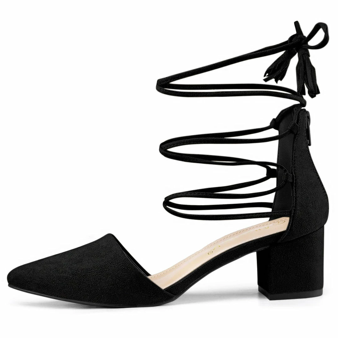 A classic vamp and slender ankle secured with lace up add crisp detail to a pointy toe pump set on a block heel which pair well with your beautiful dresses, jeans or skirts.
