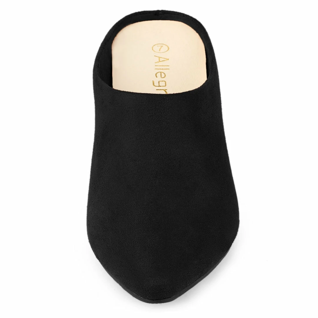 Add stylish footwear to your look with heeled mules by Allegra K. A backless style creates the slip-on design and chunky block heels finish the look.