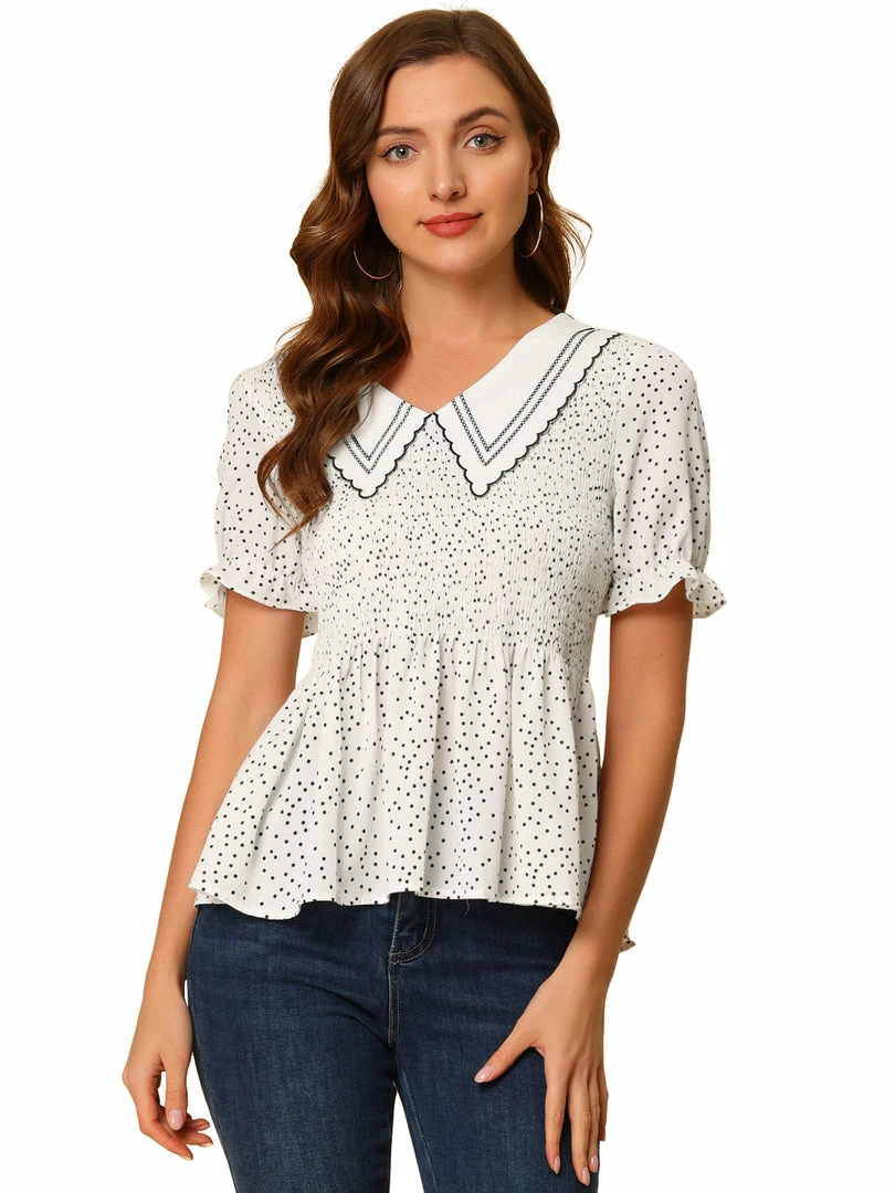 Allegra K Women’s Peter Pan Collar Polka Dots Smocked Peplum Top