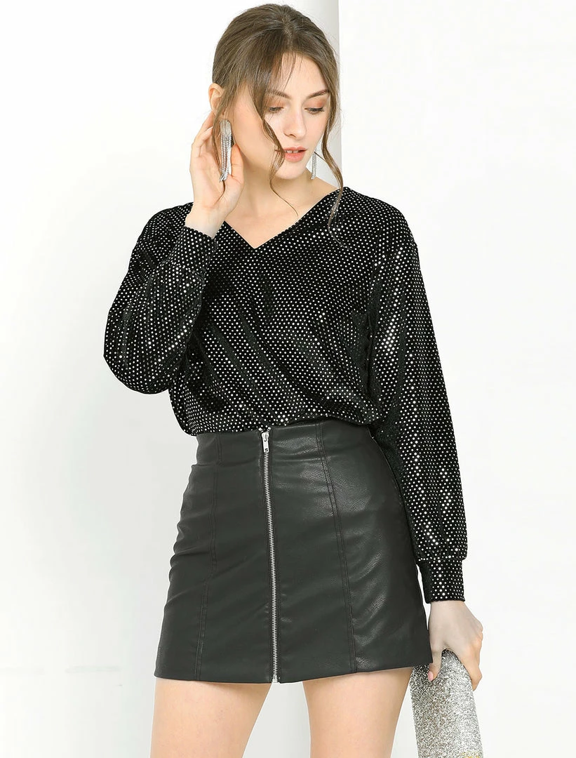 Allegra K Women’s Polka Dots Sequin Long Sleeve Pullover V Neck Blouse