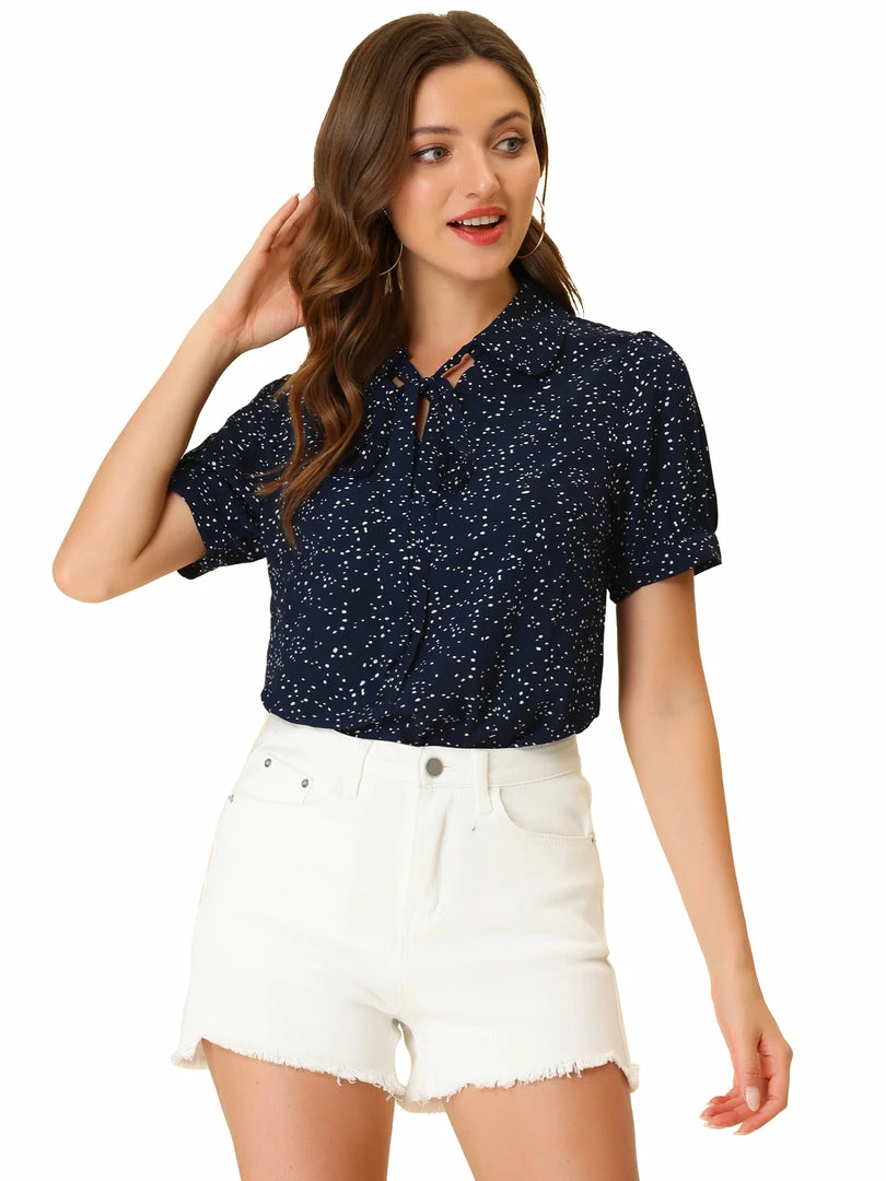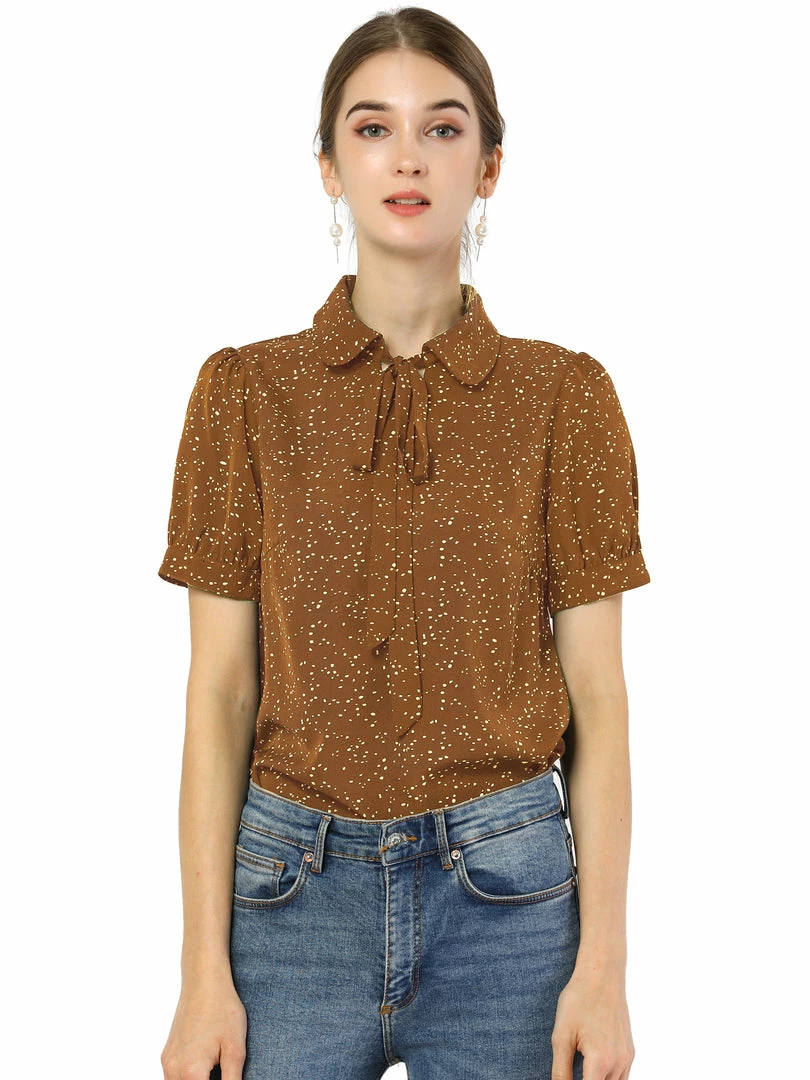 Allegra K Women’s Polka Dots Short Sleeve Bow Tie Peter Pan Collar Chiffon Blouse