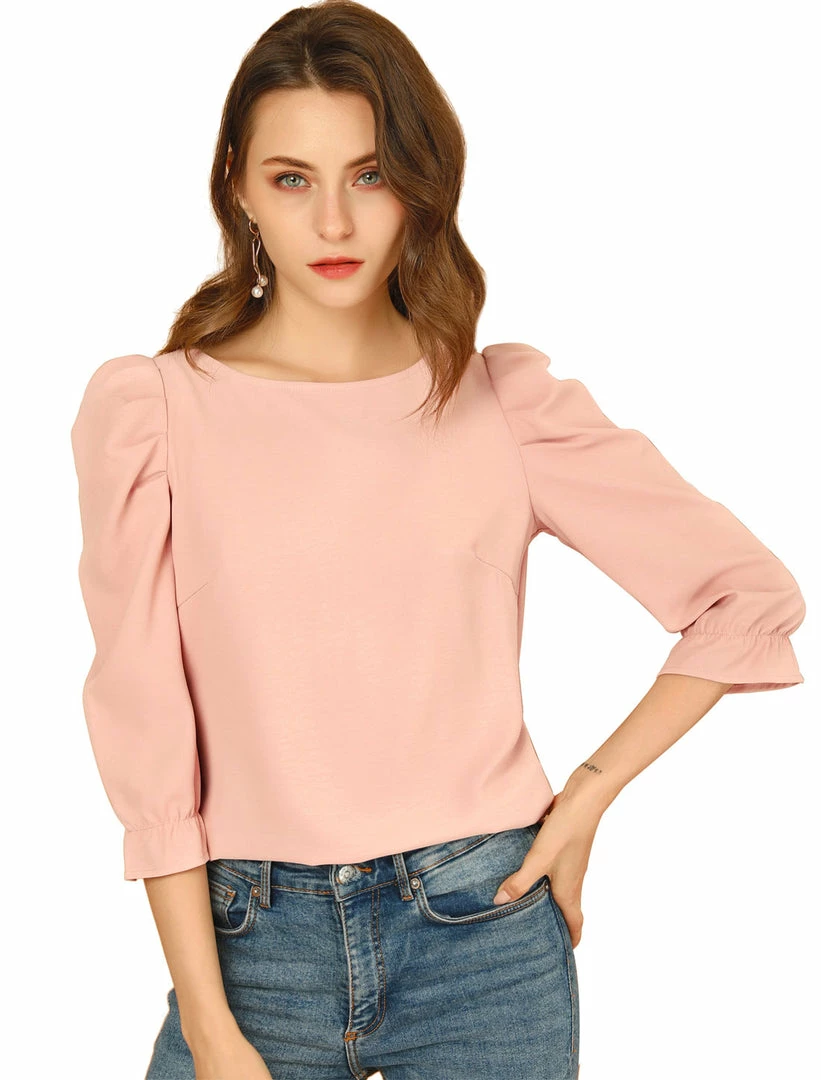 Allegra K Women’s Puff Sleeve Casual Solid Top Round Neck Ruched Vintage Pullover Blouse