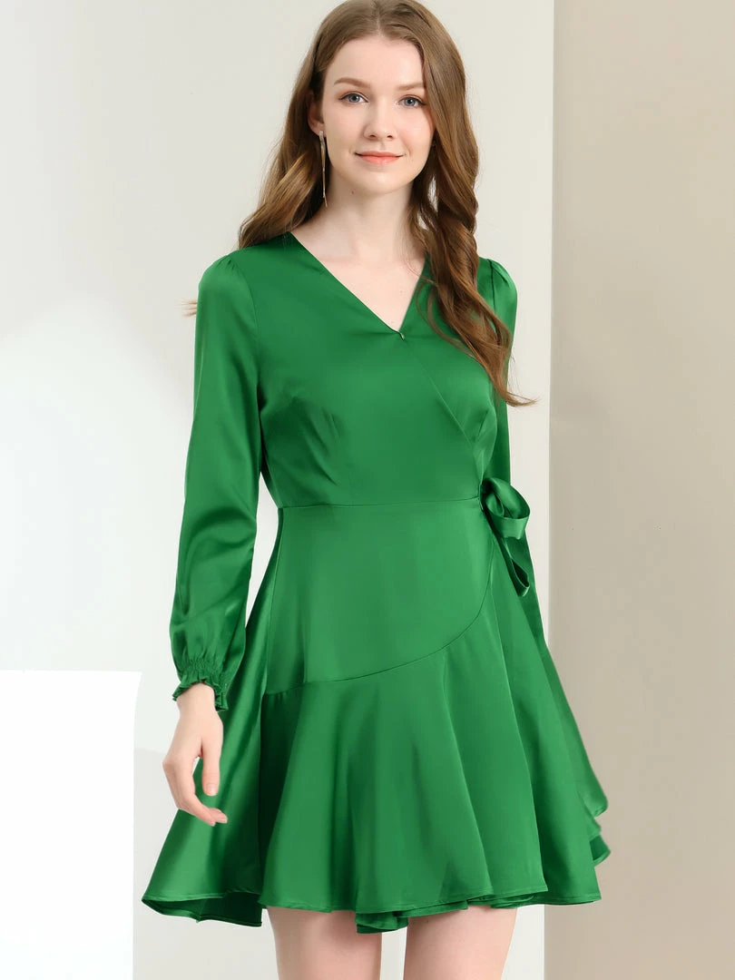 Allegra K Women’s Puff Sleeve Tie Waist Ruffle Hem Satin Wrap Mini Dress