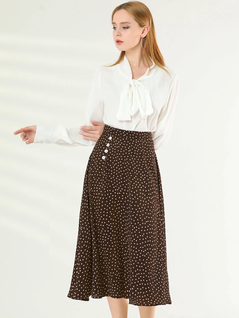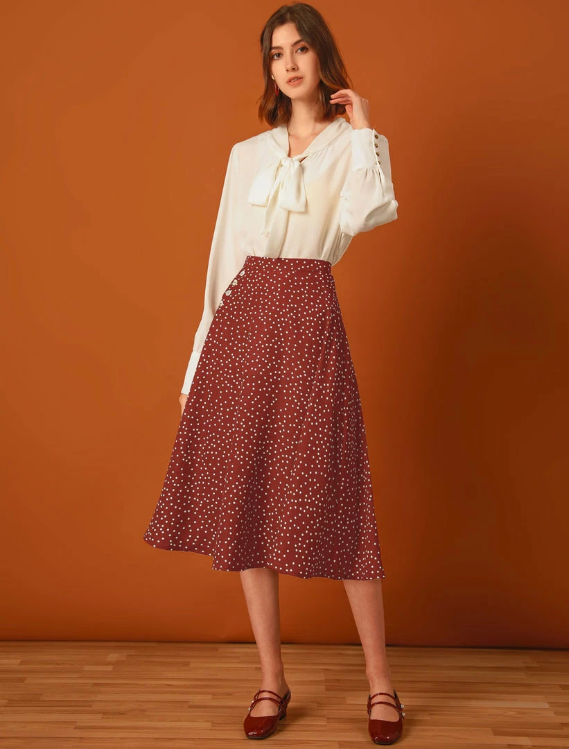 • Allover polka-dots print adds a vintage style to this flattering midi skirt.