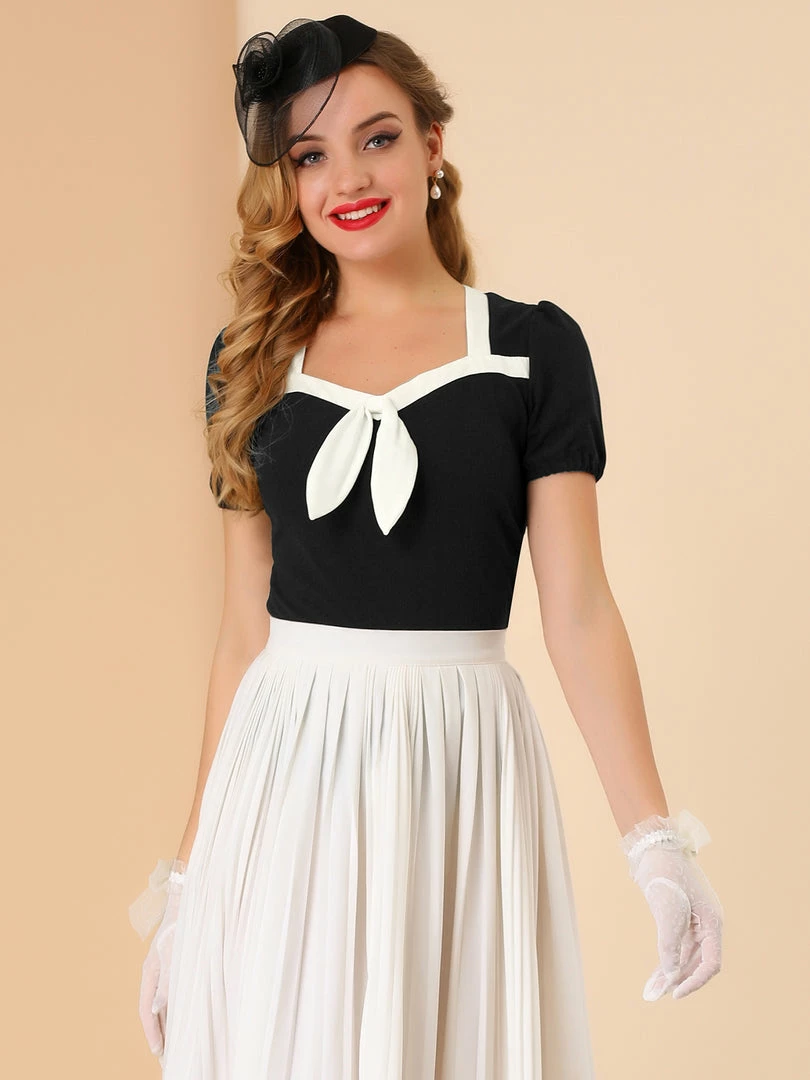 Allegra K Women’s Retro Sweetheart Neck Contrast Bow Tie Short Sleeve Blouse