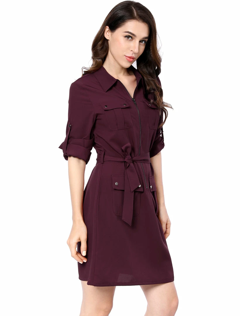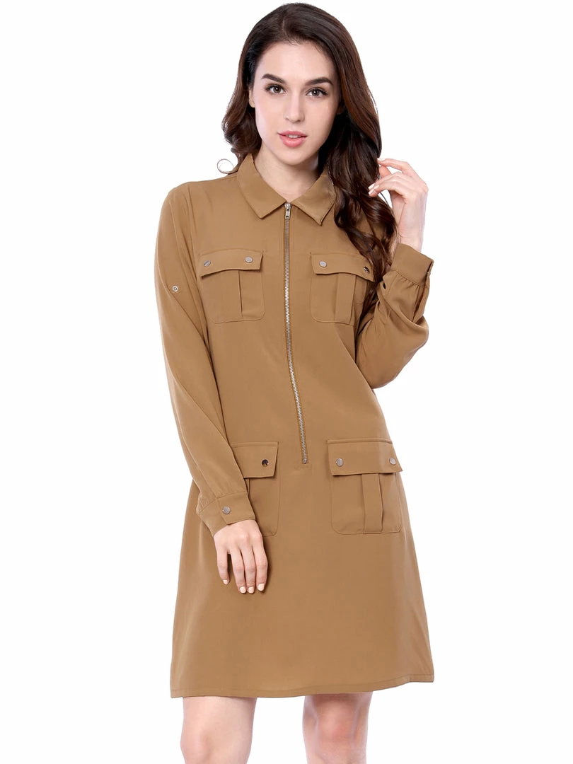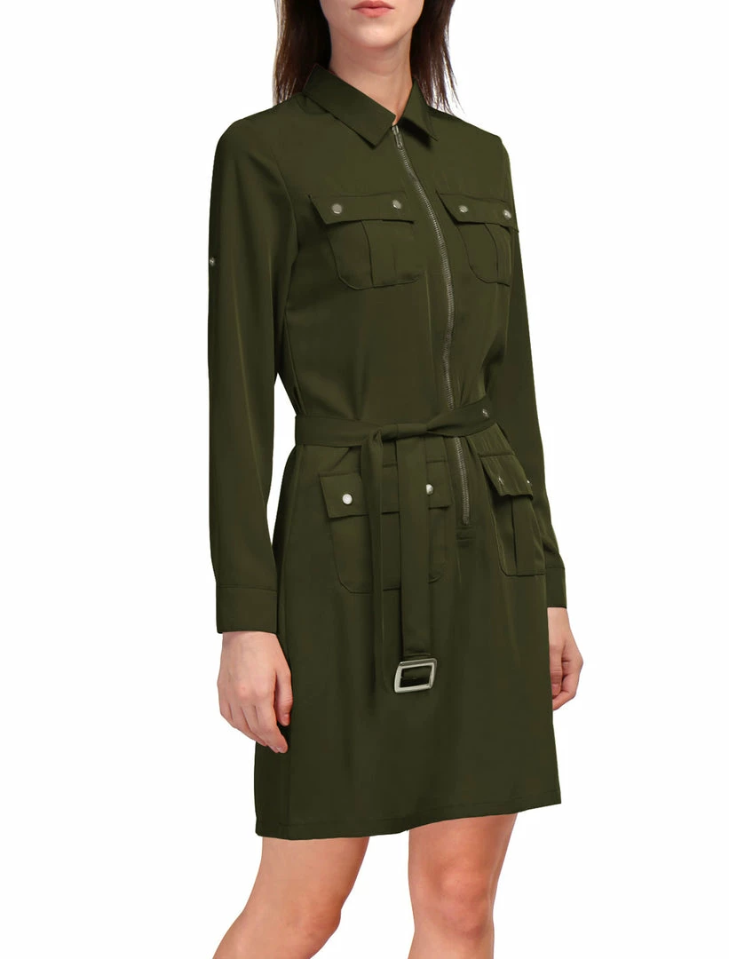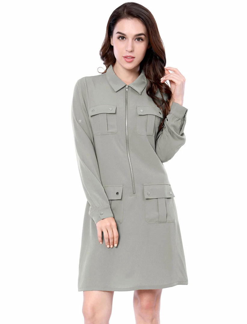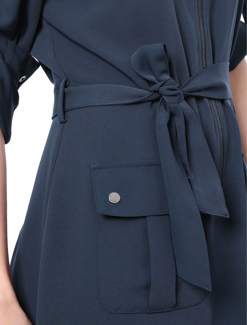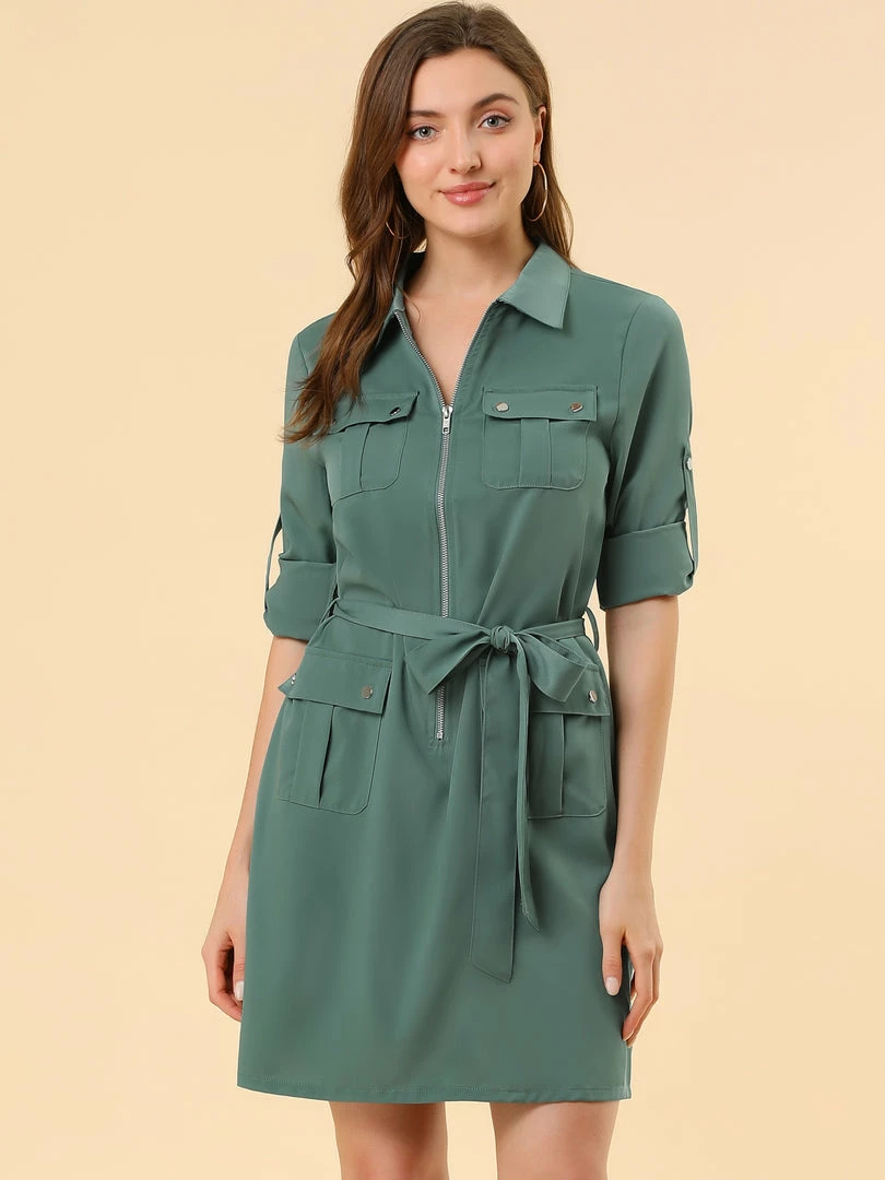 • A streamlined, chic reinterpretation of the belted shirt dress, accented with half zip placket, four buttoned pockets front and roll up sleeves.