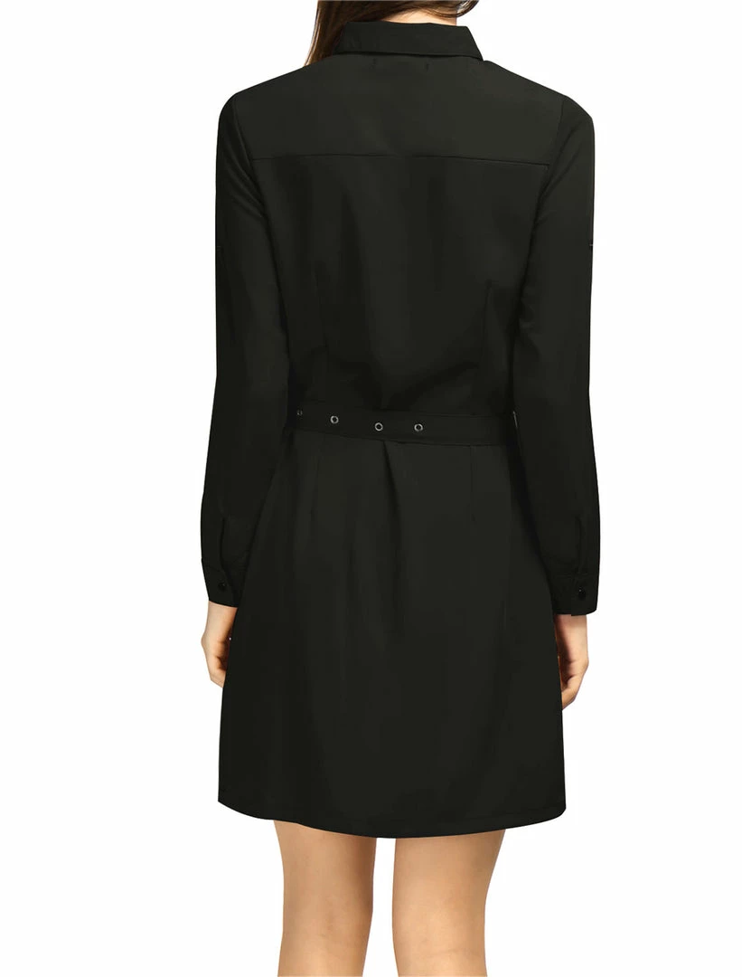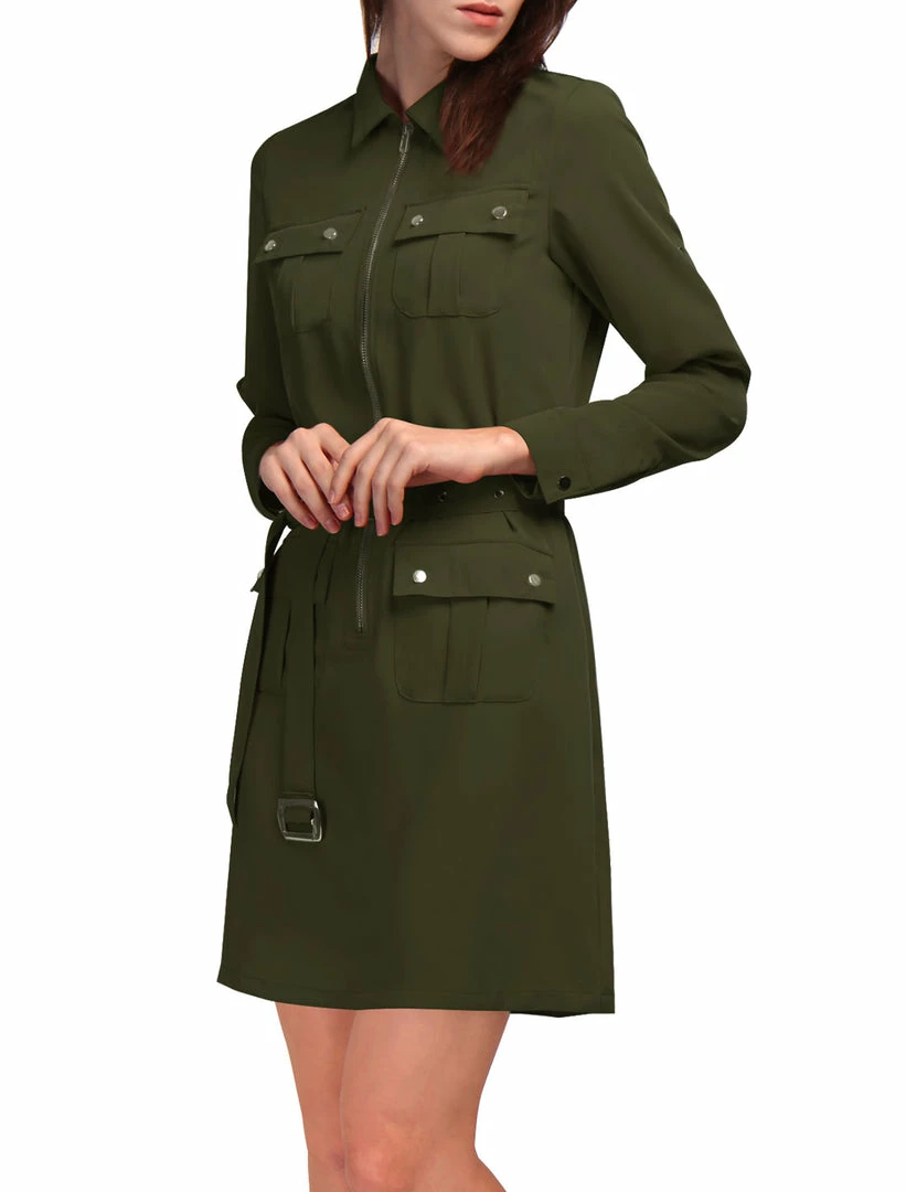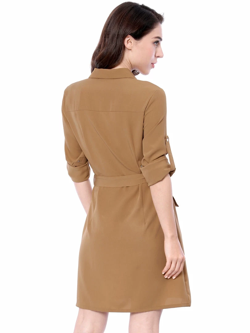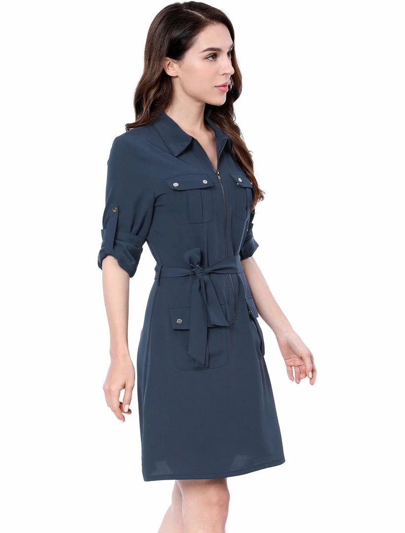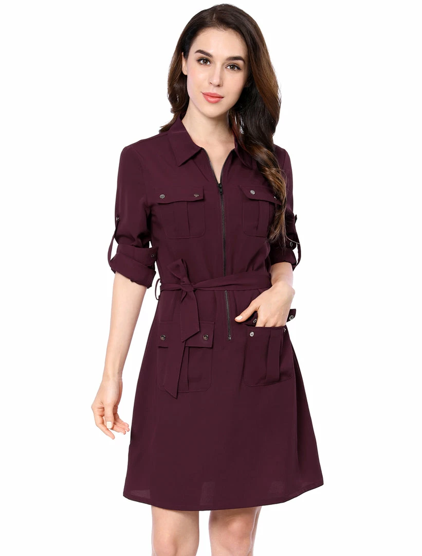 • A streamlined, chic reinterpretation of the belted shirt dress, accented with half zip placket, four buttoned pockets front and roll up sleeves.