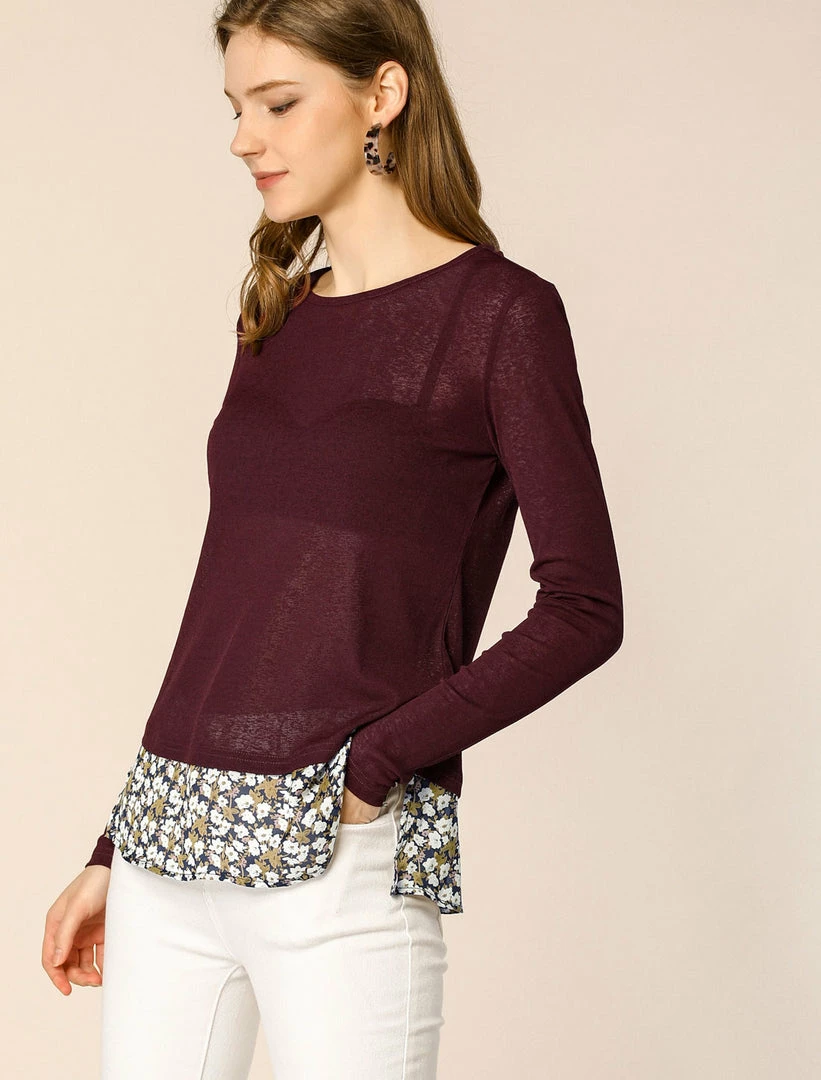 Allegra K Women’s Round Neck Long Sleeves Tops Knit Side Slits Floral Hem Blouse