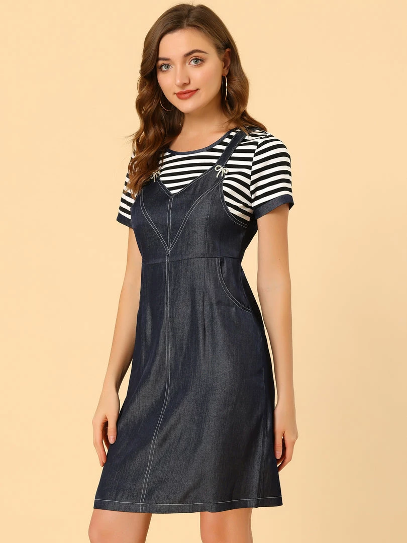 Women’s Fake Two-Piece Crewneck Stripe Top Suspender Dress