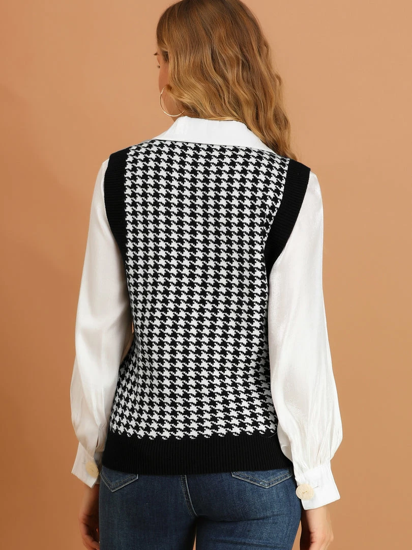 - This fashionable knit sweater vest is designed with exquisite houndstooth pattern knit. It is an elegant, and soft ladies’ shirt.