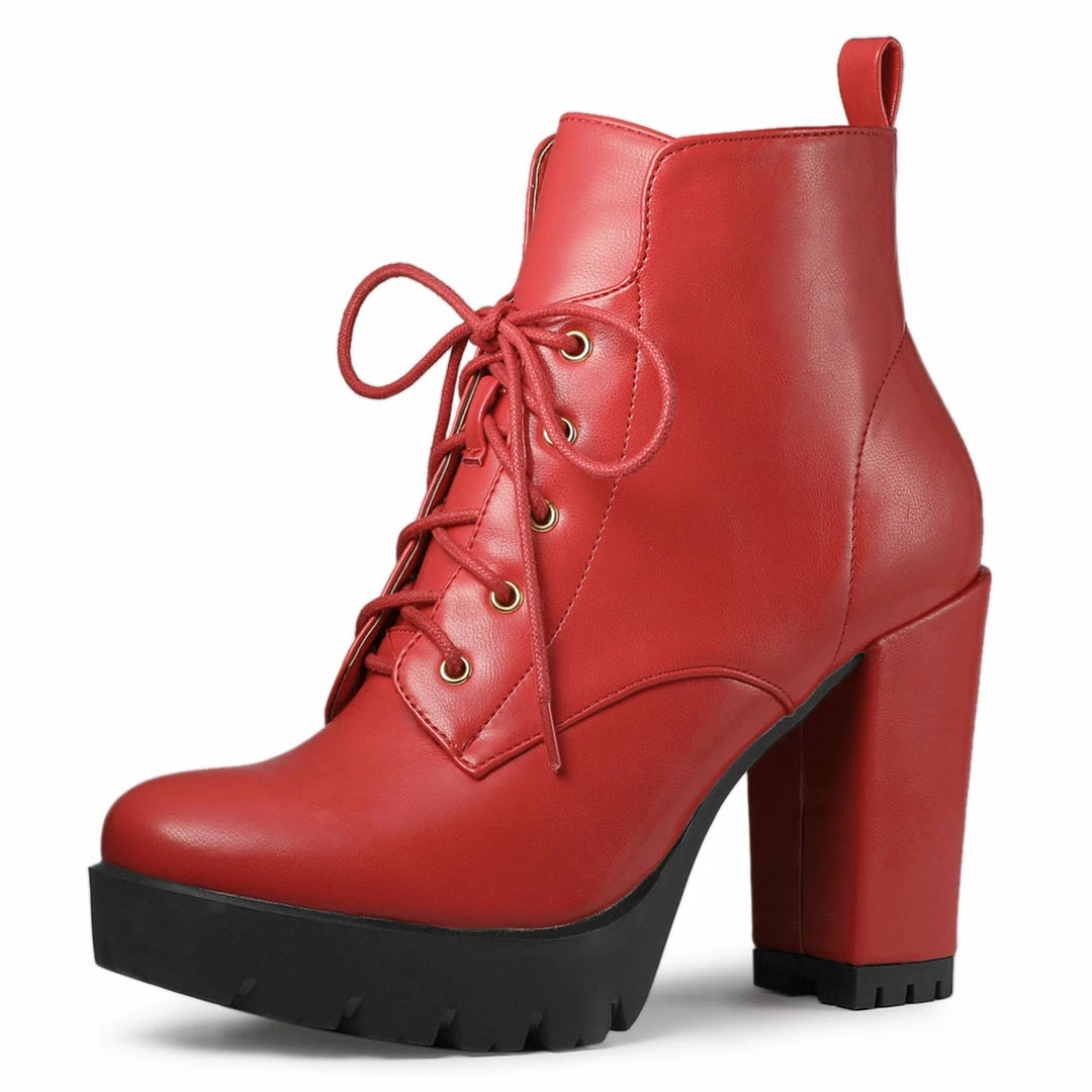 If you haven’t got yourself a pair of platform ankle boots, what are you waiting for? Featuring a round toe, lace ups, side zip, cleated platform sole and a block heel. Style them up with a co-ord skirt set and beret.