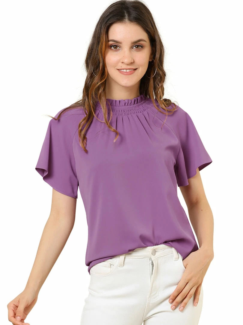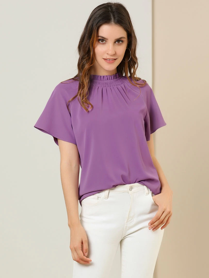 Allegra K Women’s Ruched Ruffle Neckline Casual Short Sleeve Keyhole Back Blouse