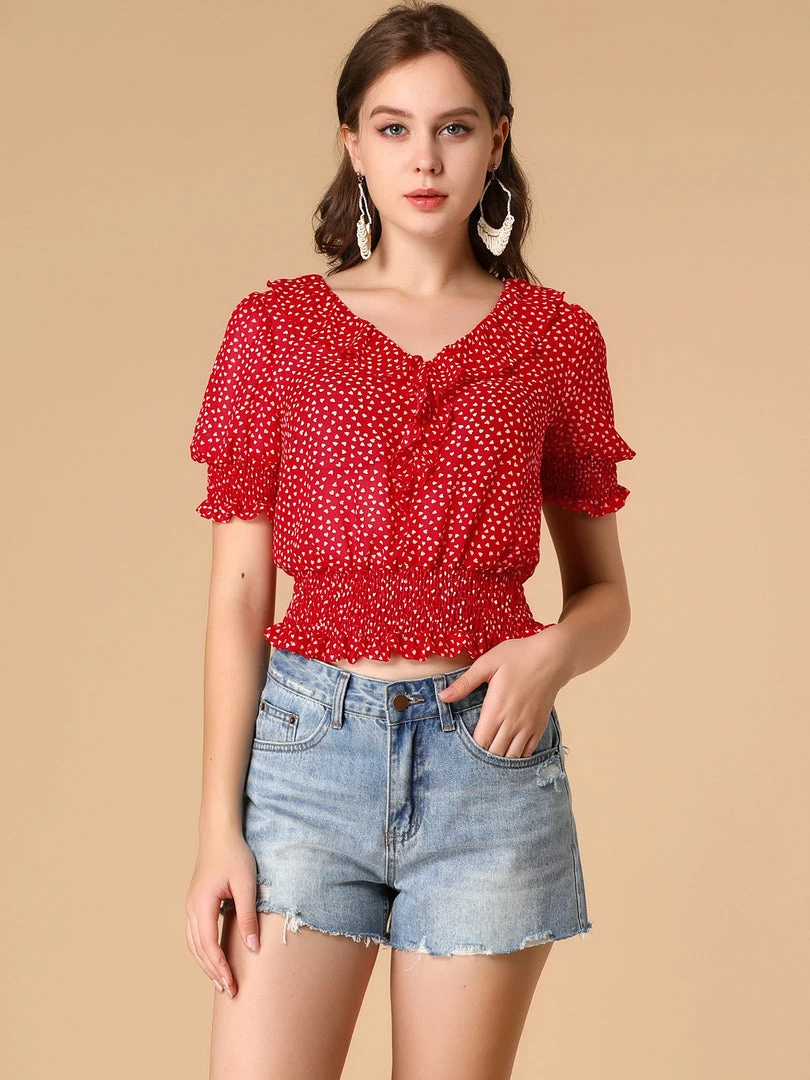 Allegra K Women’s Ruffle Collar Smocked Waist Short Sleeve Blouse Dots Top