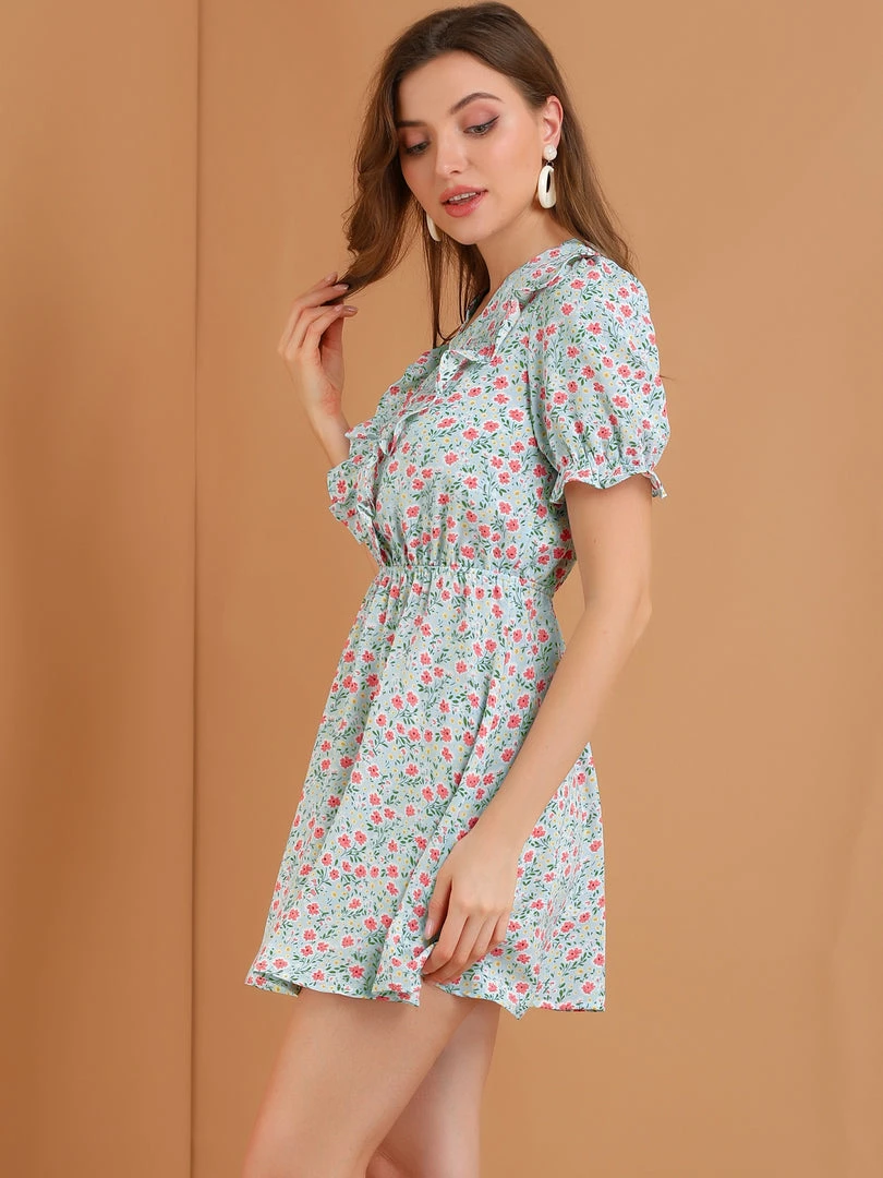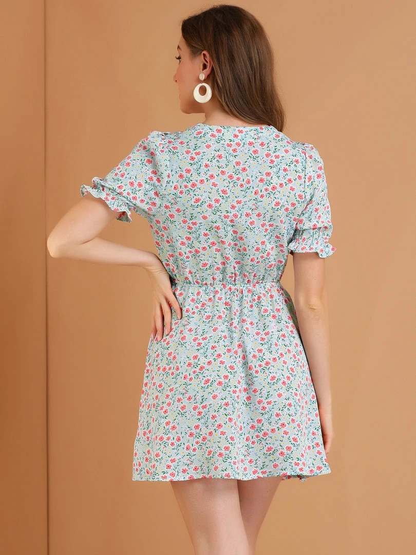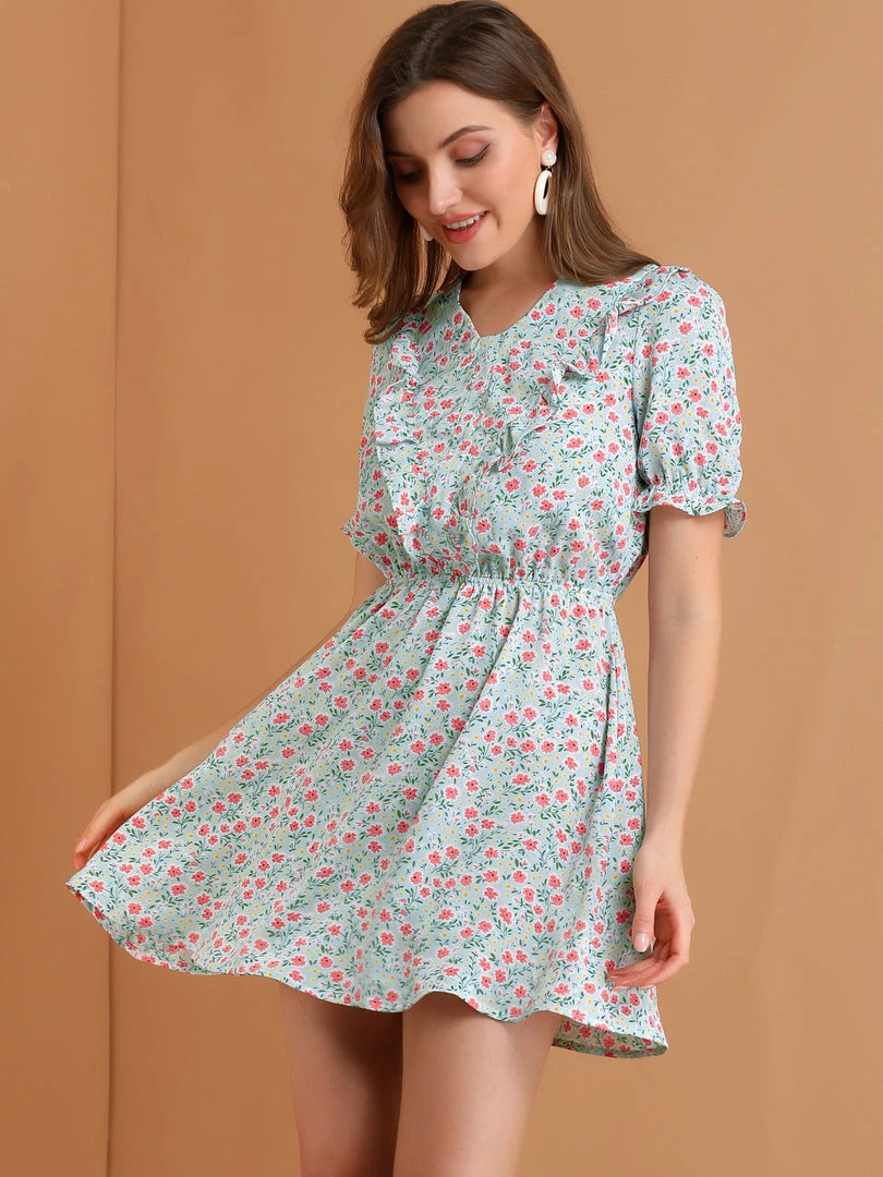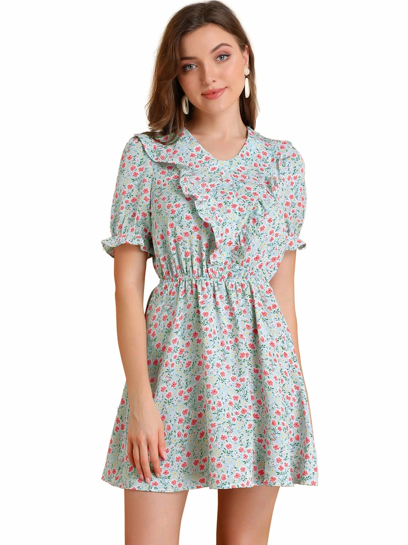 Allegra K Women’s Ruffle Front V-Neck Short Puff Sleeve A-Line Mini Floral Dress